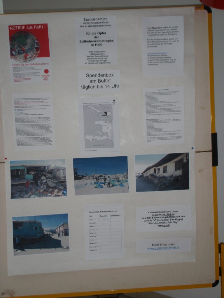 Am B[r]G Enns läuft die Spendenaktion bis zu den Semesterferien mit einer Sammelbox beim Schulbuffet täglich bis 14 Uhr, und mit einem Kuchenbuffet der 5G am Mittwoch 10.2.2010 in der großen Pause!