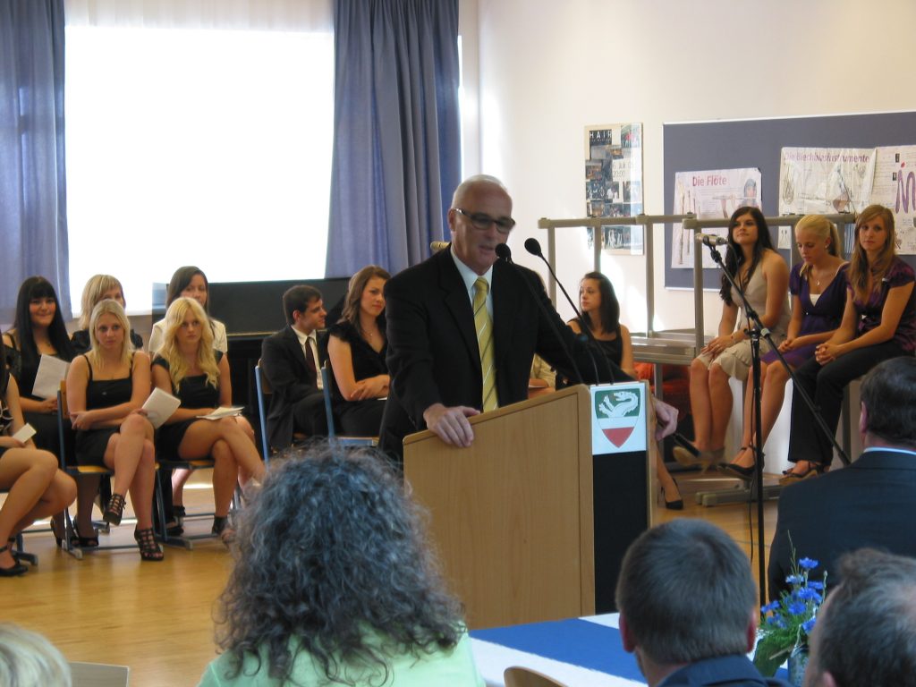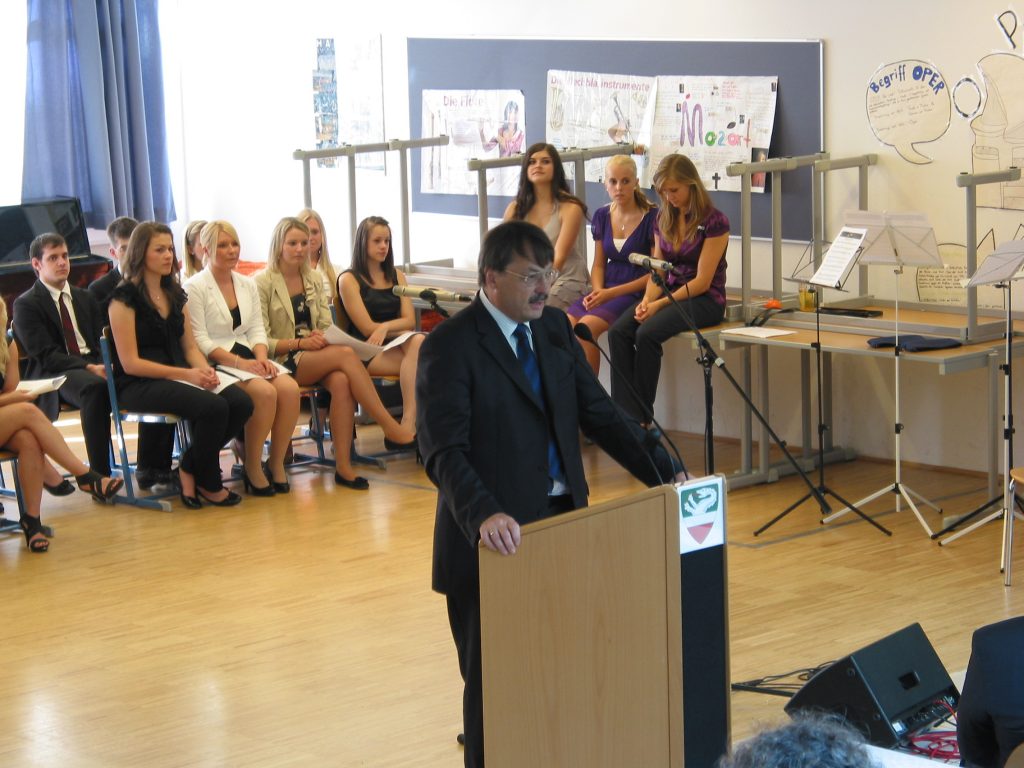 Bei 12 Kandidaten und Kandidatinnen gelang dies mit ausgezeichnetem Erfolg, bei 14 mit gutem Erfolg. Sowohl der Vorsitzende der Prüfungskommission, HR Mag. Rudolf Fuchs vom BG Vöcklabruck, als auch Direktor HR Mag. Franz Pröll betonten die Wichtigkeit einer fundierten Allgemeinbildung. Die Klassenvorstände Mag. Michaela Hörmann (8A ), Mag. Thomas Kaiser (8B ) und Mag. Hannes Haunschmidt (8G ) hoben das vielfältige Engagement der Schüler und Schülerinnen während der vergangenen acht Jahre hervor.