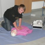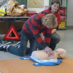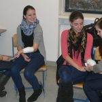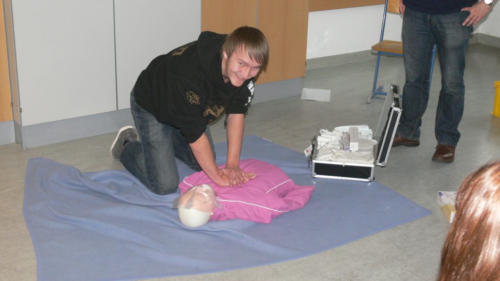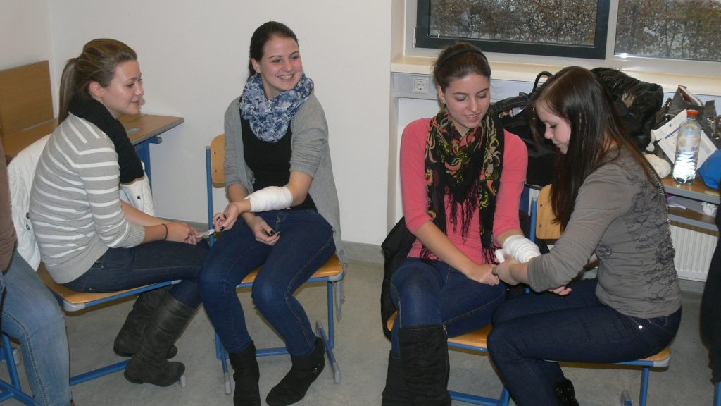 Dabei wurde von den Referenten das richtige Verhalten bei Unfällen oder Notsituationen erklärt und von den SchülerInnen auch eifrig geübt. Neben dem Anlegen von Verbänden und dem Üben der Reanimierungsmaßnahmen wurde auch der Einsatz des Defibrillators demonstriert.