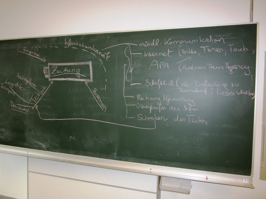 Die SchülerInnen machten sich in Gruppen Gedanken, welche Prozesse und Personen vonnöten sind, bis eine Tageszeitung den Leser erreicht. Zudem wurden anhand von acht tagesaktuellen österreichischen Zeitungen die Headlines der Seite 1 verglichen und bewertet.