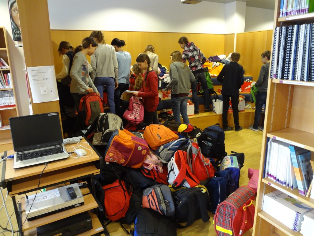 Als am Freitag vergangener Woche (1. März 2013) nach der großen Pause die im Zuge des Rucksackprojekts abgegebenen Spenden vorlagen, machten sich einige sehr fleißige Helfer ans Werk, die vollen Rucksäcke zu kontrollieren und ergänzen, was fehlte, bzw. zu entfernen, was überzählig war oder nicht in die Rucksäcke hinein gehörte. Nachdem sie schließlich auch noch die vielen Einzelspenden geordnet und gezählt hatten, lag endlich das überwältigende Ergebnis des Projektes vor: