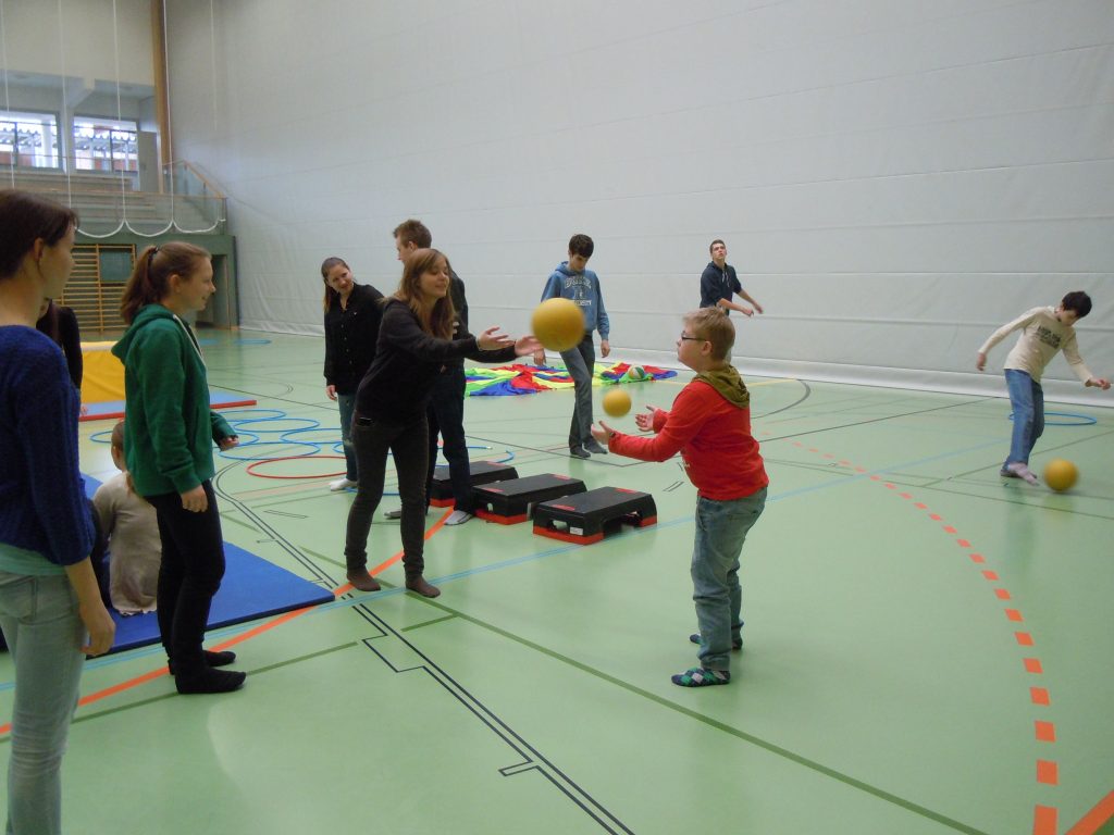 Im Rahmen von Hand in Hand treffen sich seit fast 8 Jahren SchülerInnen der Sonderschule Hart-Leonding und des Gymnasiums Enns. Gestartet hat die Aktion Kollegin Mag. Bianca Thalhammer, weitergeführt wurden die Begegnungen von Mag. Dagmar Öhler und jetzt Mag. David Weinberger. Am Donnerstg, 4, April 2013, waren wieder einmal die speziellen SchülerInnen im b[r]g Enns zu Besuch. Gemeinsam spielten wir in der Turnhalle, gestalteten ein Riesen-Plakat, aßen und stießen mit (Kinder)Sekt auf den SchEz-Preis an.