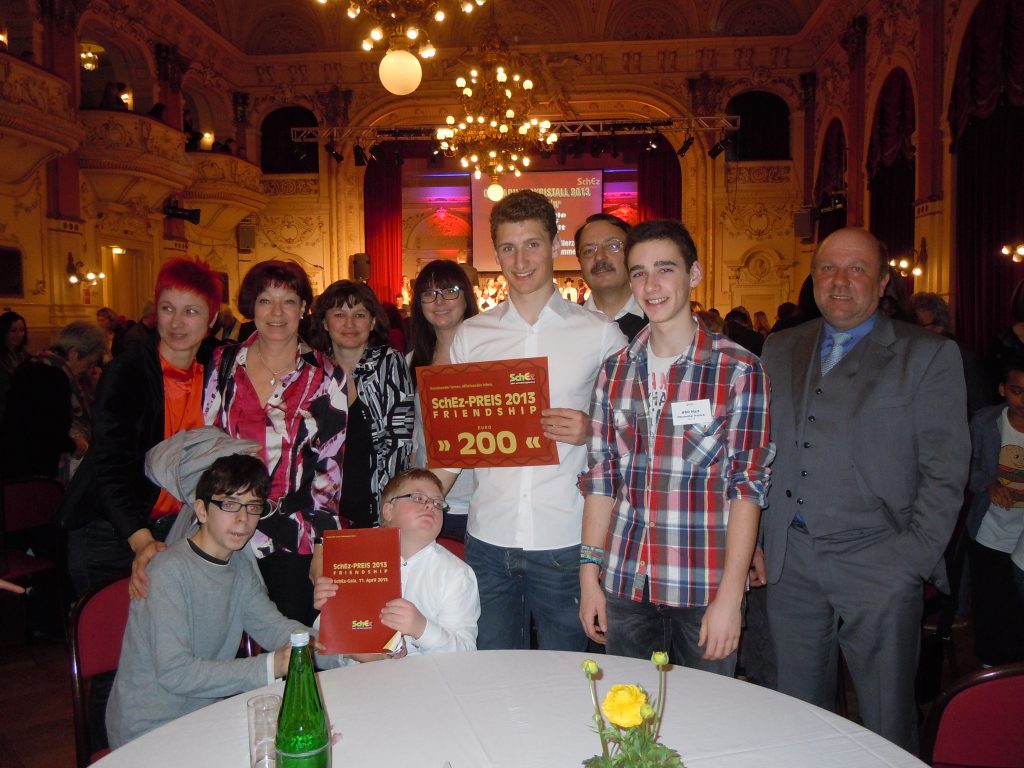 Das Schul- und Erziehungszentrum(SchEz) Linz hat eine Prämierung zum Thema „Friendship“ ausgeschrieben. Bei der großen SchEz-Gala 2013 am 11. April im Kaufmännischen Vereinshaus in Linz konnten wir einen Nomminierungs-Preis und einen Scheck in der Höhe von € 200,- entgegennehmen. Patrick Obermüller, der Klassensprecher der 7B, und Fuat, ein Schüler der Sonderschule Hart-Leonding, nahmen auf der Bühne den Preis in Empfang.
