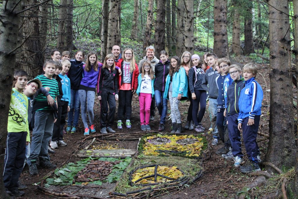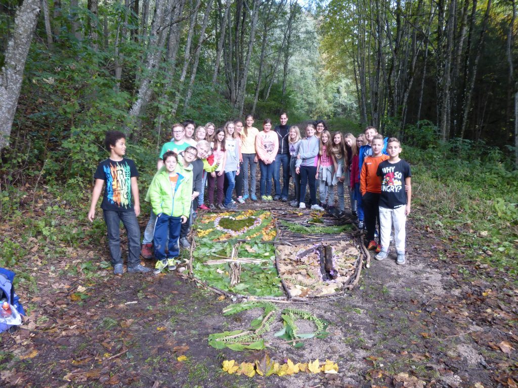 Herrman Hirner und Gebhard Alber leiteten am Donnerstag Workshops, in denen jede Klasse ihre eigene Klassenhymne komponierte und ein Klassenwappen mit Materialien aus der Natur gestaltete. Themen wie Gemeinschaft, Freundschaft, Zusammenhalt und gemeinsames Erreichen von Zielen standen im Mittelpunkt. Um genug Blätter, Äste, Moos, Blumen und Steine zu finden, kletterten wir zwischen Sträuchern und Bäumen auf steilen Hängen herum und hatten großen Spaß dabei, so richtig dreckig zu werden! Beide Projekte wurden ein großer Erfolg.