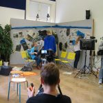 Da ich mich für alle Departements sehr interessierte, wartete ich ab, welche Jobs übrig blieben und meldete mich erst dann. Im Endeffekt war ich gemeinsam mit meinem Team für das Bühnenbild zuständig. Uns wurde ein großer Dachboden voller Möbel, Accessoires, alten Fernsehern und Pflanzen gezeigt. Aus diesen Einrichtungsgegenständen konnten wir auswählen und somit das Studioaussehen prägen. Abgesehen von den Sitzgelegenheiten für unsere Talkshowgäste, sollten wir auch den Hintergrund, also die Wände, passend zum Gesprächsthema gestalten. Der Kreativität waren in diesem Falle keine Grenzen gesetzt. Während die eine Hälfte unserer Arbeitsgruppe unten im Malkeller an der künstlerischen Gestaltung der Wände arbeitete, wählten die anderen in der Zwischenzeit passende Möbel aus und transportierten sie nach unten. Das Gesamtkonzept aus Vordergrund und Hintergrund musste stimmen, das heißt, wir besprachen uns oft und entschieden uns dann für eine Linie. Obwohl wir unter einem gewissen Zeitdruck standen, konnte sich das Endprodukt unserer Arbeit sehen lassen. Die Wände hatten wir mit unzähligen Zeitungsartikeln, die das Flüchtlingsthema behandelten, tapeziert. Über die Zeitungsausschnitte hatten wir zerrissene Müllsacke, die einerseits eine Art Flüchtlingszelt symbolisieren sollten und andererseits für das Chaos und den Müll innerhalb der Lager stehen sollten, befestigt. Das Bühnenbild veranschaulichte noch einmal die Lebensbedingungen der Menschen auf der Flucht. Für die Schauspieler – später Talkshowgäste – dienten gelbe, zusammenklappbare Campingsessel als Sitzgelegenheiten.
