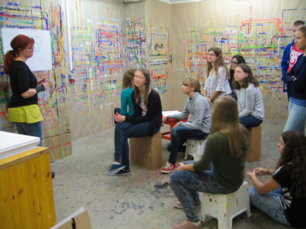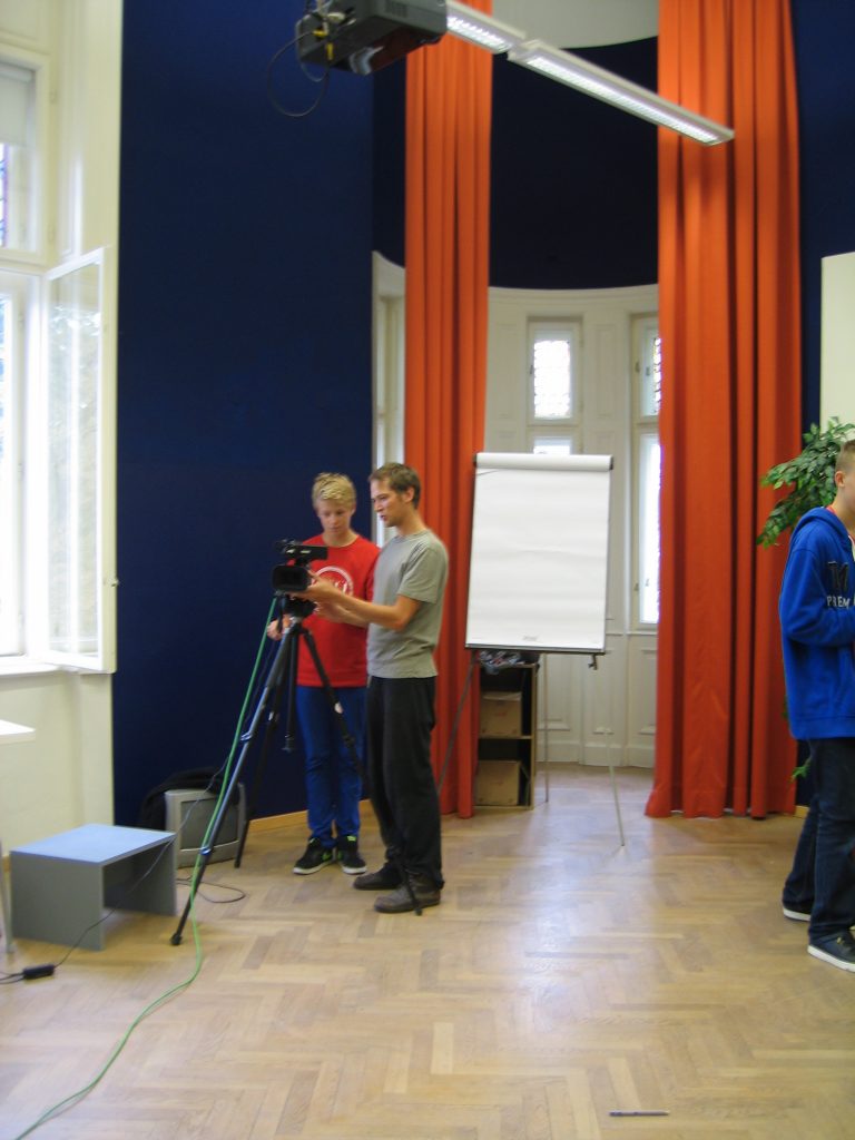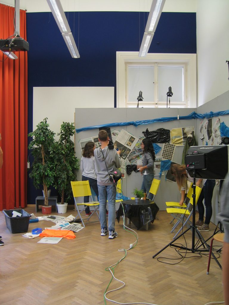 Da ich mich für alle Departements sehr interessierte, wartete ich ab, welche Jobs übrig blieben und meldete mich erst dann. Im Endeffekt war ich gemeinsam mit meinem Team für das Bühnenbild zuständig. Uns wurde ein großer Dachboden voller Möbel, Accessoires, alten Fernsehern und Pflanzen gezeigt. Aus diesen Einrichtungsgegenständen konnten wir auswählen und somit das Studioaussehen prägen. Abgesehen von den Sitzgelegenheiten für unsere Talkshowgäste, sollten wir auch den Hintergrund, also die Wände, passend zum Gesprächsthema gestalten. Der Kreativität waren in diesem Falle keine Grenzen gesetzt. Während die eine Hälfte unserer Arbeitsgruppe unten im Malkeller an der künstlerischen Gestaltung der Wände arbeitete, wählten die anderen in der Zwischenzeit passende Möbel aus und transportierten sie nach unten. Das Gesamtkonzept aus Vordergrund und Hintergrund musste stimmen, das heißt, wir besprachen uns oft und entschieden uns dann für eine Linie. Obwohl wir unter einem gewissen Zeitdruck standen, konnte sich das Endprodukt unserer Arbeit sehen lassen. Die Wände hatten wir mit unzähligen Zeitungsartikeln, die das Flüchtlingsthema behandelten, tapeziert. Über die Zeitungsausschnitte hatten wir zerrissene Müllsacke, die einerseits eine Art Flüchtlingszelt symbolisieren sollten und andererseits für das Chaos und den Müll innerhalb der Lager stehen sollten, befestigt. Das Bühnenbild veranschaulichte noch einmal die Lebensbedingungen der Menschen auf der Flucht. Für die Schauspieler – später Talkshowgäste – dienten gelbe, zusammenklappbare Campingsessel als Sitzgelegenheiten.