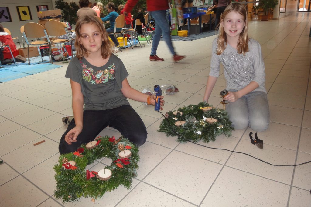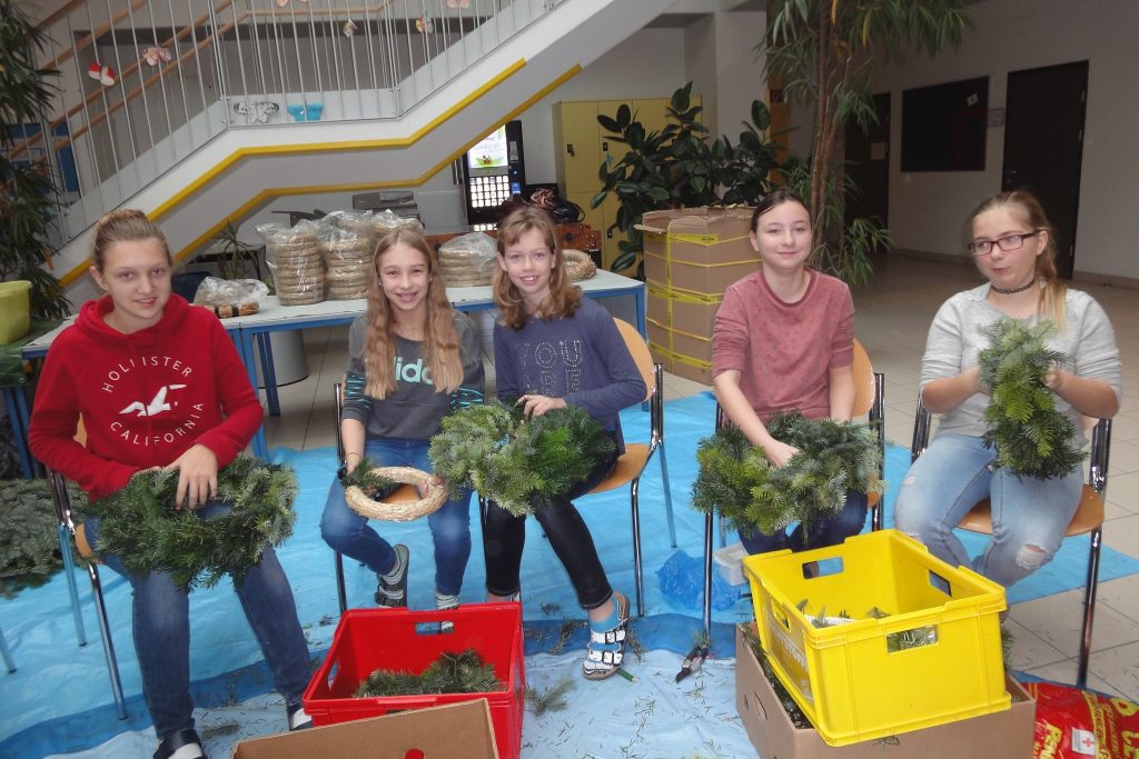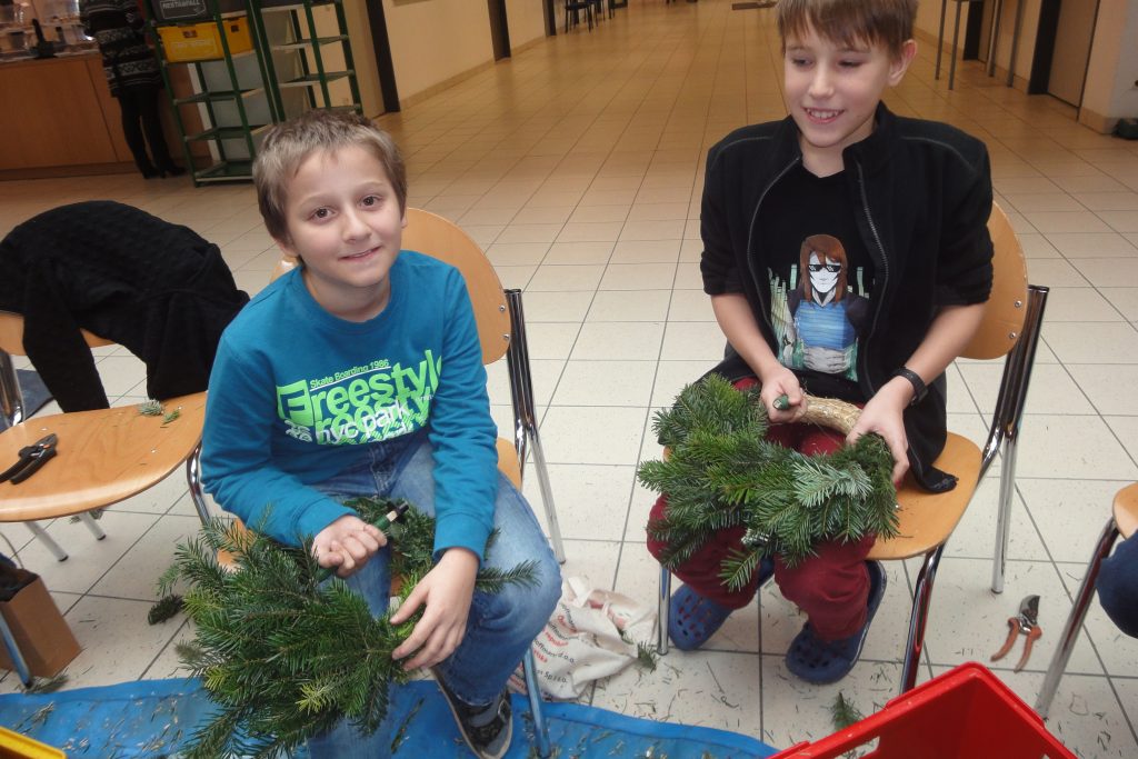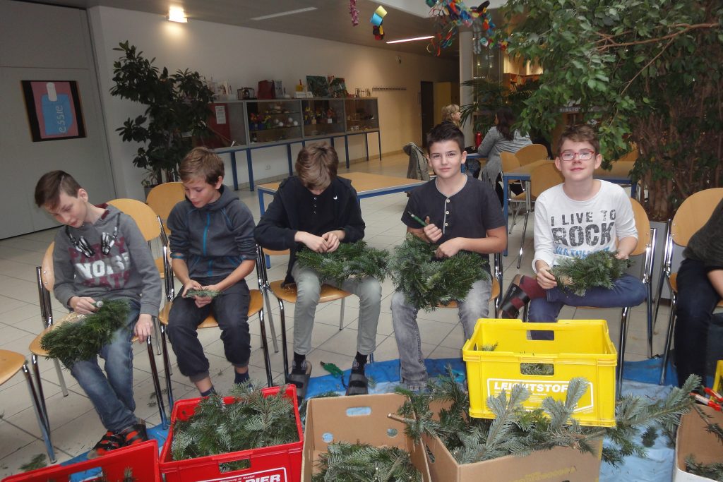 … findet im kath. Religionsunterricht einiger Klassen das Adventkranzbinden statt. Auch heuer wurde das Angebot wieder sehr eifrig angenommen – die SchülerInnen und LehrerInnen haben ganze 80 Exemplare gebunden. Der Reisigduft in der Aula verbreitete gleich eine adventliche Stimmung. Das Projekt war eine angenehme Abwechslung, ein gemeinschaftliches Miteinander und eine Möglichkeit, sich handwerklich und sinnlich zu betätigen. Am Ende war jeder Kranz einmalig und wartet nun auf das adventliche Feiern zuhause. Danke an Mag. Richter-Gutternigg, die wie jedes Jahr den großen Schulkranz für die Aula gebunden hat.