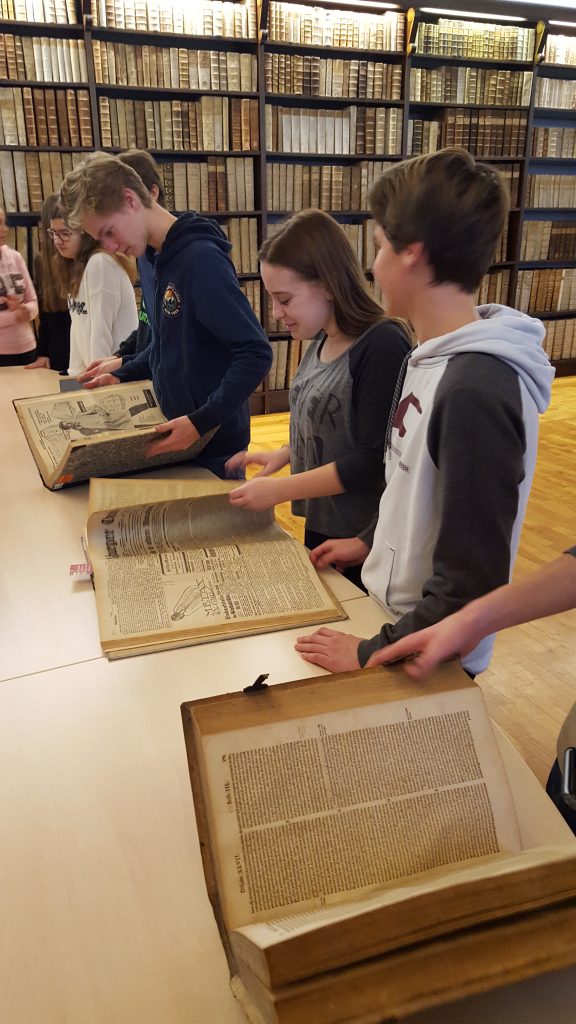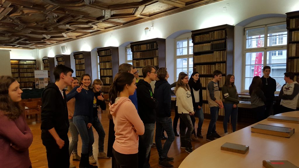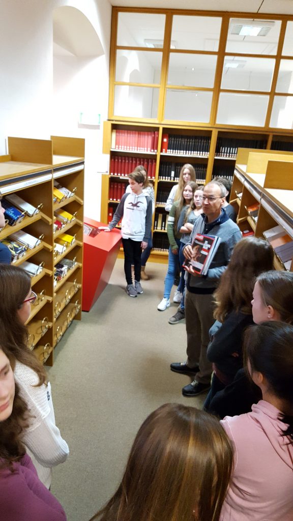 Danach ging es weiter zur Führung in der Hauptbibliothek, wo uns Herr Haring in die Geheimnisse des Magazins und in die Online-Recherche für die VWA einführte. Dort erhielten die SchülerInnen auch ihre Bibliotheksausweise für die UB-Salzburg, mit dem sie in Zukunft u. a. auch für die VWA Buchausleihen tätigen können.