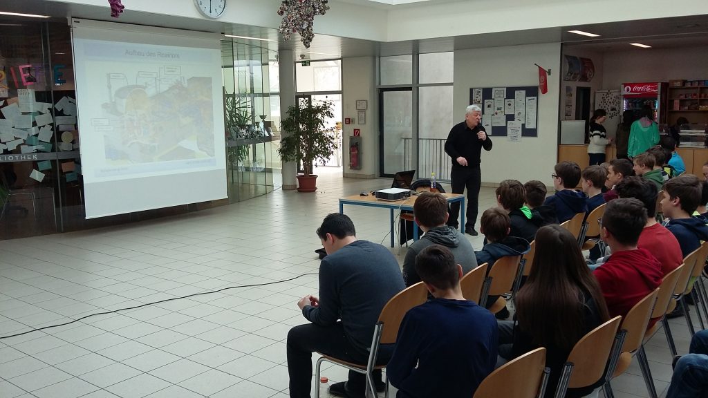 Die 4. Klassen des b[r]g Enns nahmen am ersten Tag nach den Semesterferien an einem Vortrag des Antiatomkomitees Freistadt in der Aula teil. Der Vortragende Dipl.-Ing. Manfred Doppler brachte den SchülerInnen einerseits die Eigenschaften radioaktiver Strahlung sowie das Grundprinzip eines Atomreaktors näher, andererseits erläuterte er auch die Gefahren der Kernkraft. Die jungen ZuhörerInnen wurden so auch zum Nachdenken angeregt und hatten am Ende noch Gelegenheit, Fragen zu stellen.