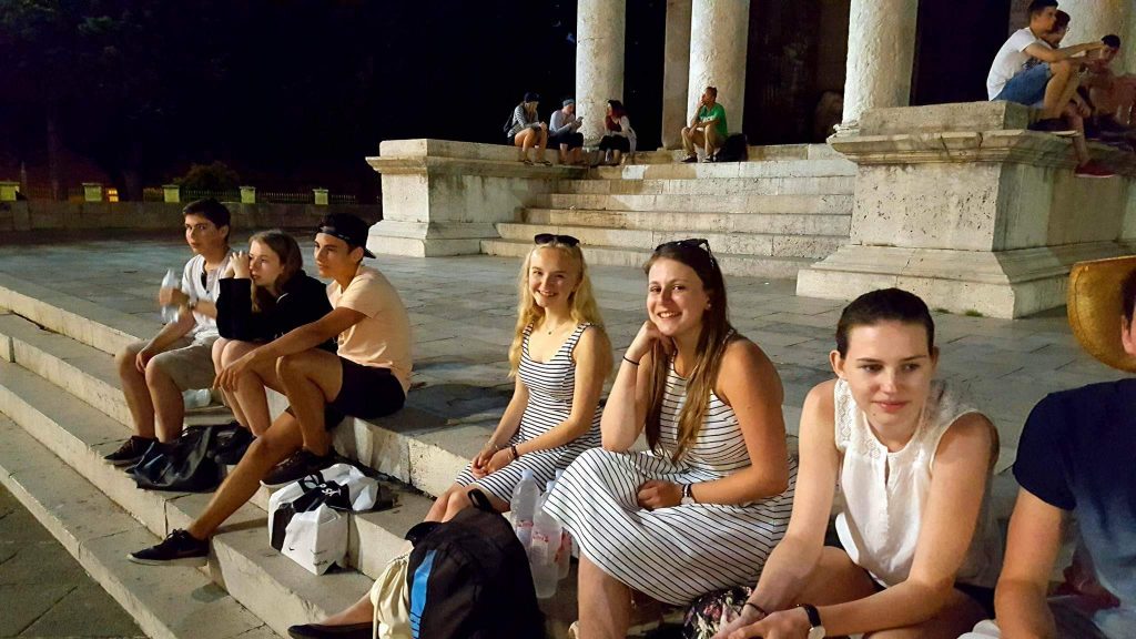 Obwohl wir dann schon etwas müde waren, fuhren wir alle am Abend noch in die Altstadt von Pula. Viele von uns gingen dort noch etwas Essen, einige zum McDonalds, andere in eines der vielen Restaurants. Danach erkundeten wir die Altstadt und entdeckten unter anderem einen Candy Shop und viele kleine Stände, an denen Sonnenbrillen und etliche andere Sommerartikel verkauft wurden.