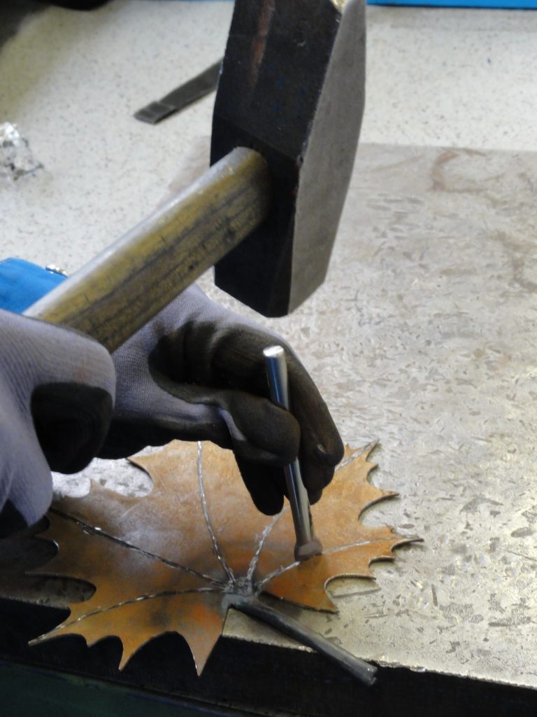 Man nehme das Stahlblech und fertige mit Laserschnitt jeweils eine Schablone für den Ober- und Unterteil des Kerzenständers (bei diesem Projekt für den Oberteil die Form eines Ahornblattes und aus Zeitmangel in der Lehrwerkstätte bereits vorbereitet). Man länge das Stahlrohr auf ca. 1cm ab und bereite die Gewindestange vor – beides gut feilen und schleifen. Der Unterteil wird jetzt mit einem großen Hammer bearbeitet, bis die Spuren des Hammers als Muster in allen vier Richtungen gut sichtbar sind (kräftig „rühren“/drehen). Man nehme daraufhin die „Blattform“ und hämmere mit einer Portion Kraft die „Blattadern“ mit einem Stahlmeißel in das Stahlblech. Anschließend werden beide Teile aufwändig entgratet, gefeilt und geschliffen.