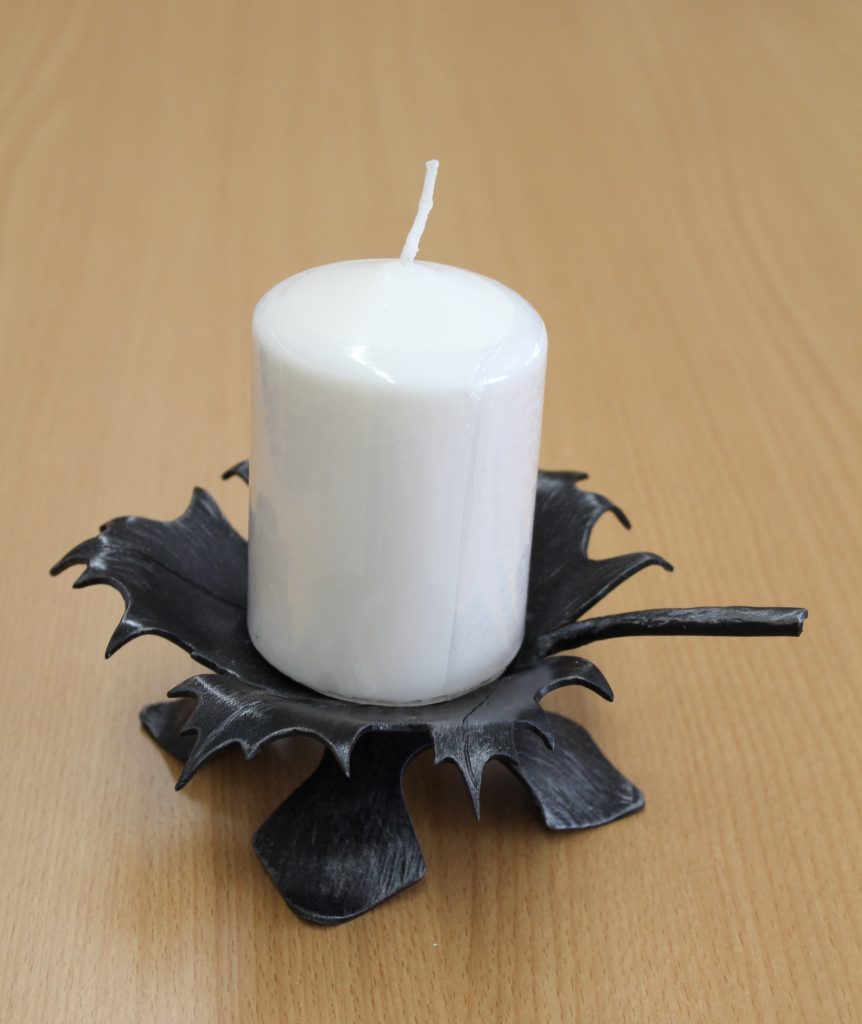 Eigentlich ist das Stahlprodukt bereits fertig – als Oberflächengestaltung kann man den Kerzenständer noch schwarz lackieren und mit einer Prise Silberlack fein verzieren oder nochmals erhitzen und mit einer Messingbürste in heißem Zustand so bearbeiten, dass die Spitzen der Blätter „golden“ glänzen.