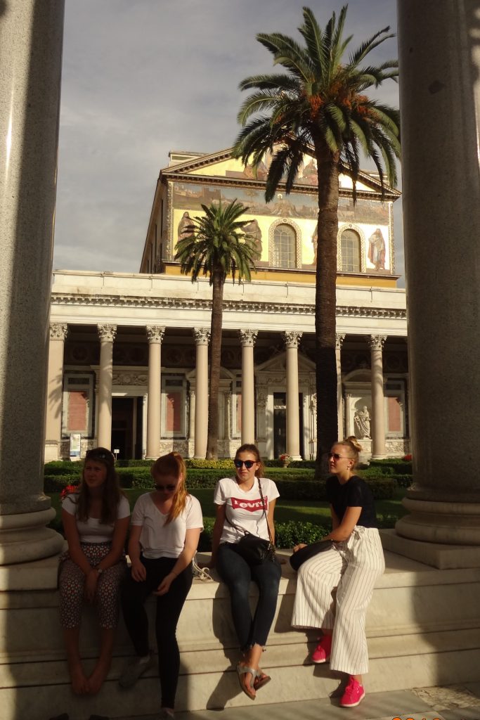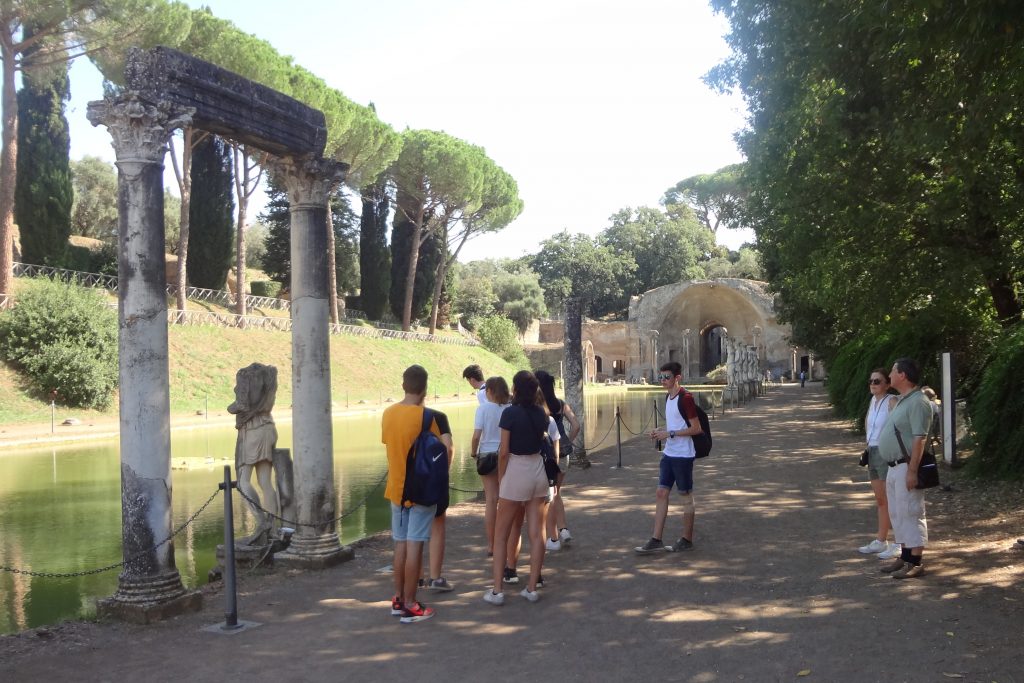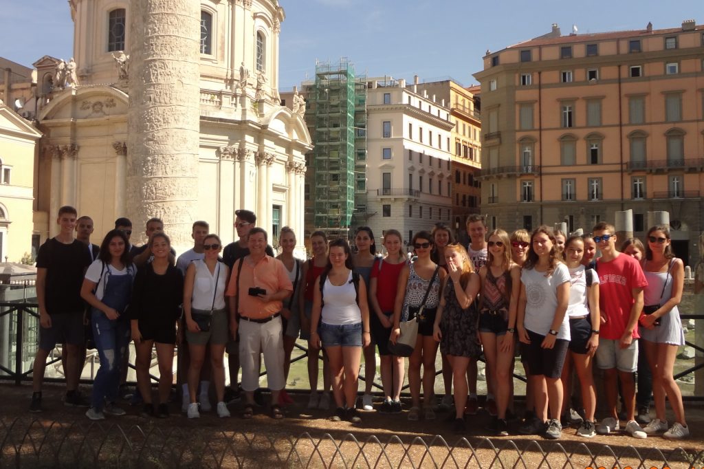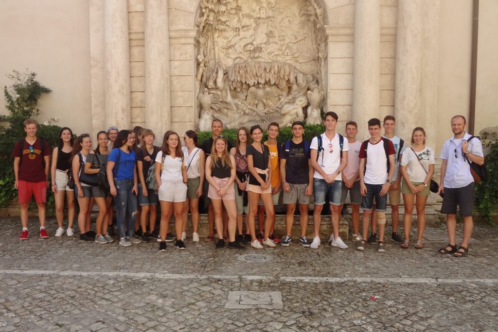 26 Latein-SchülerInnen der 8. Klassen unter Leitung bzw. in Begleitung ihrer Lehrkräfte Mag. Herbert Stöllner, Mag. Birgit Lehner und Mag. Christoph Fürlinger haben in der ersten Schulwoche Rom und das nahe gelegene Tivoli erforscht. Spätsommerliches Schönwetter, viele neue Eindrücke, Vernetzung des Wissens in Verbindung mit viel neuer Information, große körperliche Anstrengungen auf altem Straßenpflaster, Großstadterfahrungen mit Licht- und Schattenseiten (z.B. reiches kulinarisches Angebot am Abend, aber auch teils chaotische Verkehrssituation): Das sind einige mögliche Schlaglichter auf die heurigen Romtage. Auf dem Programm standen die üblichen „Highlights“ (wie das Kolosseum, die Peterskirche und die anderen Hauptkirchen) ebenso wie große Museen (Kapitol, Villa Borghese) und manch Interessantes, wohin sich Touristen seltener verirren (z.B. San Giorgio in Velabro mit dem Argentarierbogen oder die Ara Pacis). Erstmals im Programm war die erst vor kurzem ausgegrabene „Città Del’Aqua“ in der Nähe des Trevi-Brunnens, wo die Wasserleitung Aqua Virgo im Badezimmer eines reichen Römers und in einem castellum (einer Verteilerstation) endet: Das einzige bisher gefundene castellum des römischen Reiches. Der Freitag führte uns nach Tivoli zur Villa d’Este und zur Villa Adriana, und fast alle nahmen zusätzliche noch die Gelegenheit wahr, abends die Vatikanischen Museen und die Sixtinische Kapelle zu besichtigen. Erkrankungen oder andere Schwierigkeiten blieben uns zum Glück erspart, so dass wir dankbar auf erlebnisreichen Tage zurückblicken können.