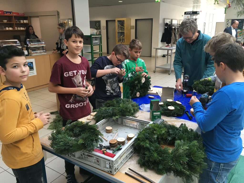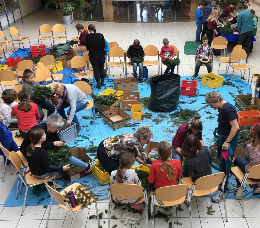 Die ersten Klassen hatten erfreulicherweise viele HelferInnen dabei: Omas, Opas, Mütter und Väter. Das macht die gemeinschaftliche Athmosphäre noch schöner. So haben alle gelernt, die Kränze selber zu binden – jetzt wissen wir, wieviel Arbeit es ist, bis ein Kranz gebunden ist und schätzen es, wenn Reisig aus der Region und nicht als Billigprodukt aus Ländern kommt, die mit viel Chemieeinsatz das Produkt herstellen. Und obendrein macht das gemeinsame Binden Spaß.
