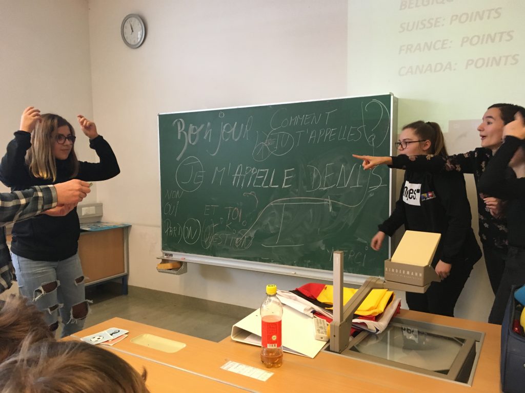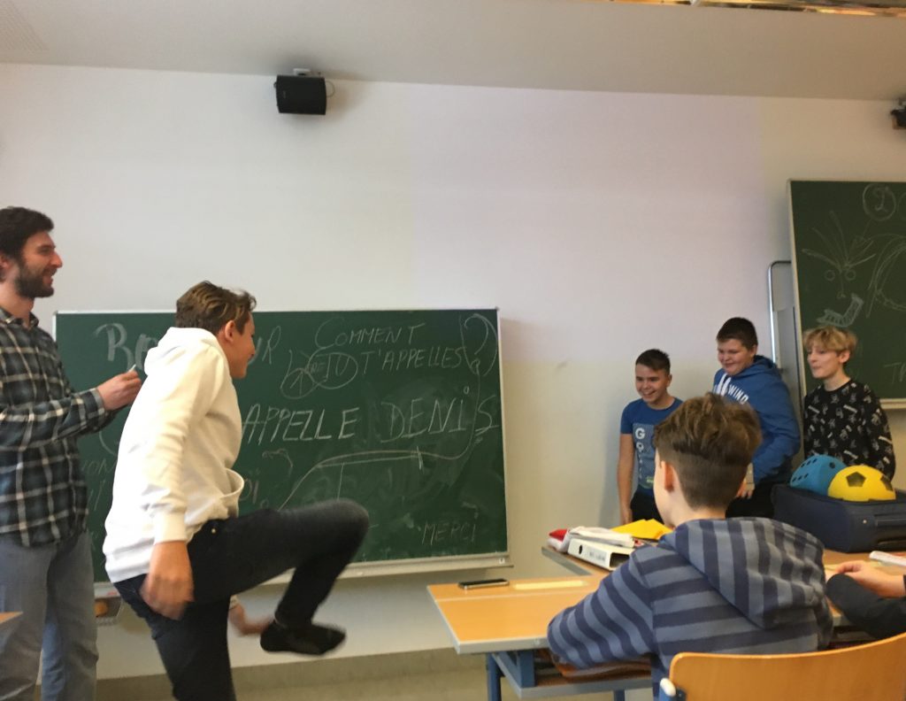Denis Pepic, Sprachassistent aus Belgien, kam mit seinem Trolley in den Klassenraum, stellte sich vor und schon ging´s los! Innerhalb kürzester Zeit füllte sich die Tafel mit ersten französischen Wörtern und Sätzen. Die Schülerinnen und Schüler waren mit großem Eifer dabei, wenn es darum ging zu erraten, was dies oder jenes auf Deutsch heißt. Sie lernten in dieser Stunde spielend leicht sich vorzustellen, bis zwölf zu zählen und erste französische Wörter, die dann pantomimisch in einem Gruppenwettbewerb dargestellt wurden. Außerdem bekamen sie einen Überblick über die Welt der Frankophonie, also über die Länder, in denen Französisch gesprochen wird.