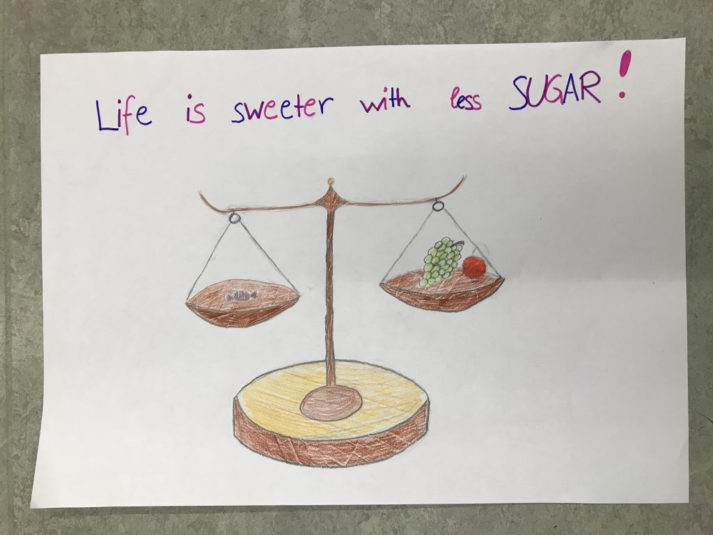 Die Schülerinnen und Schüler der 6. Klassen haben im WPG Englisch zum Thema „Zucker, Lebensmittel und Abhängigkeit“ kreative Poster gestaltet. Diese Poster sollen vielen Schülerinnen und Schülern bewusst machen, dass Zucker in 80% aller Lebensmittel enthalten ist und vor allem Kohlenhydrate viel Zucker enthalten. Die Plakate hängen in der Schule um ein Bewusstsein zu schaffen und ein wenig aufzuwecken. Life is sweeter with less sugar!