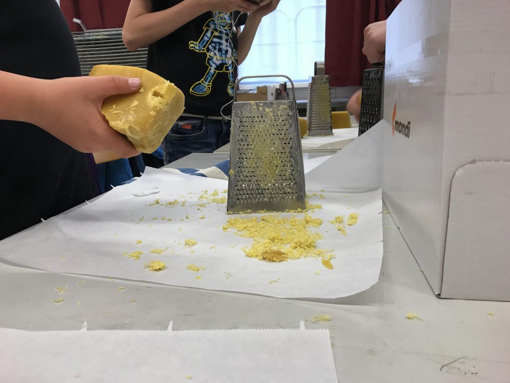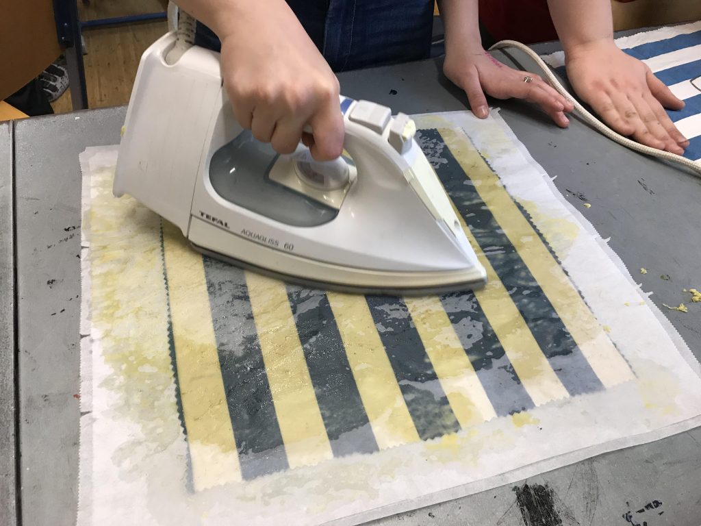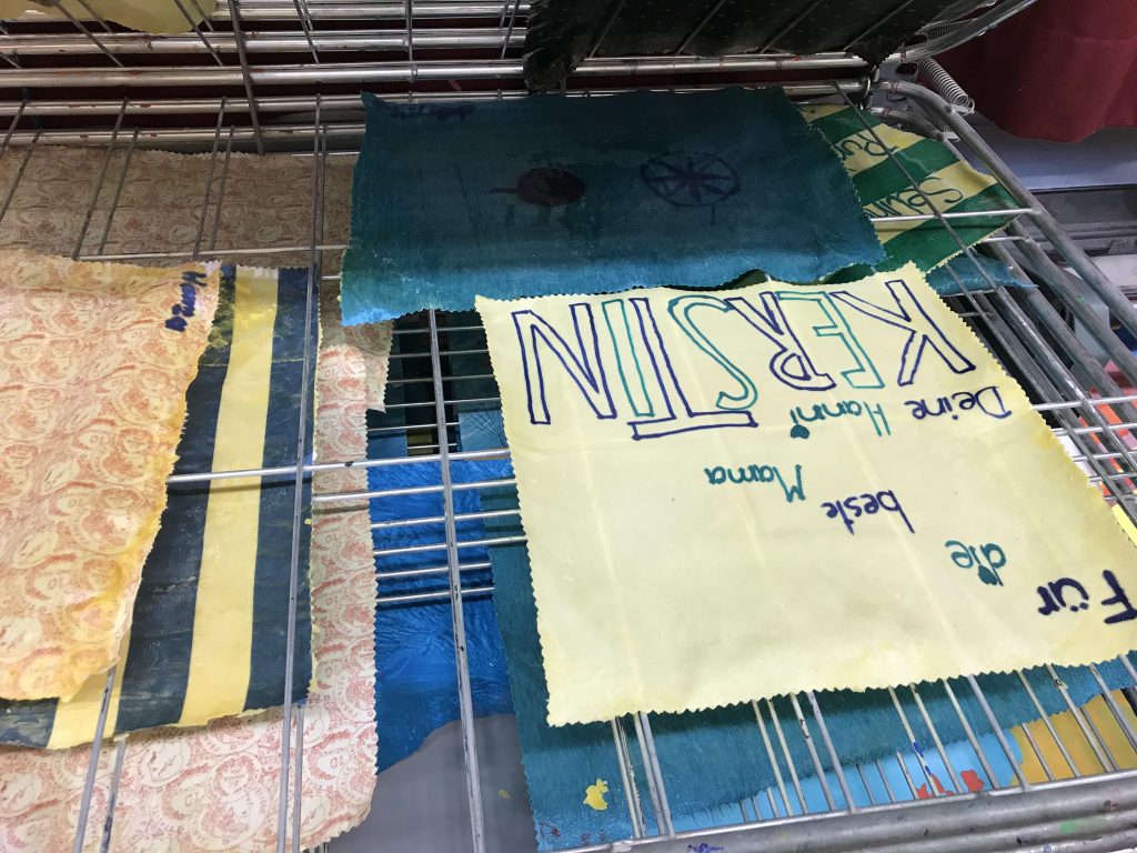 Im Zuge des Umweltprojekts der 2D und 5A/B, in dem sich die SchülerInnen dieser beiden Klassen mit verschiedensten Aspekten des Klimaschutzes auseinandersetzten, entschied sich die 2D gemeinsam mit ihren Lehrerinnen Frau Mag. Haiger und Frau Mag. Wintereder selber Bienenwachstücher herzustellen. An einem ruhigen Nachmittag in der Schule schnitten die einen SchülerInnen emsig Baumwollstoffe zu und gestalteten sie individuell mit Stoffmalfarben, während andere bereits die großen Bienenwachsstücke zu kleinen Spänen rieben. Danach wurde fleißig gebügelt, Wachs geschmolzen und die tollen Ergebnisse bestaunt. Die selbstgemachten Bienenwachstücher sind aber nicht nur schön geworden, sondern erfüllen als Jausenbox- und Frischhaltefolie-Ersatz für frisches Obst und belegte Brote auch einen sinnvollen praktischen und vor allem plastikfreien Zweck.