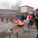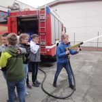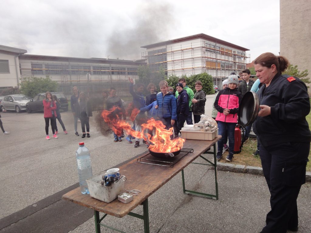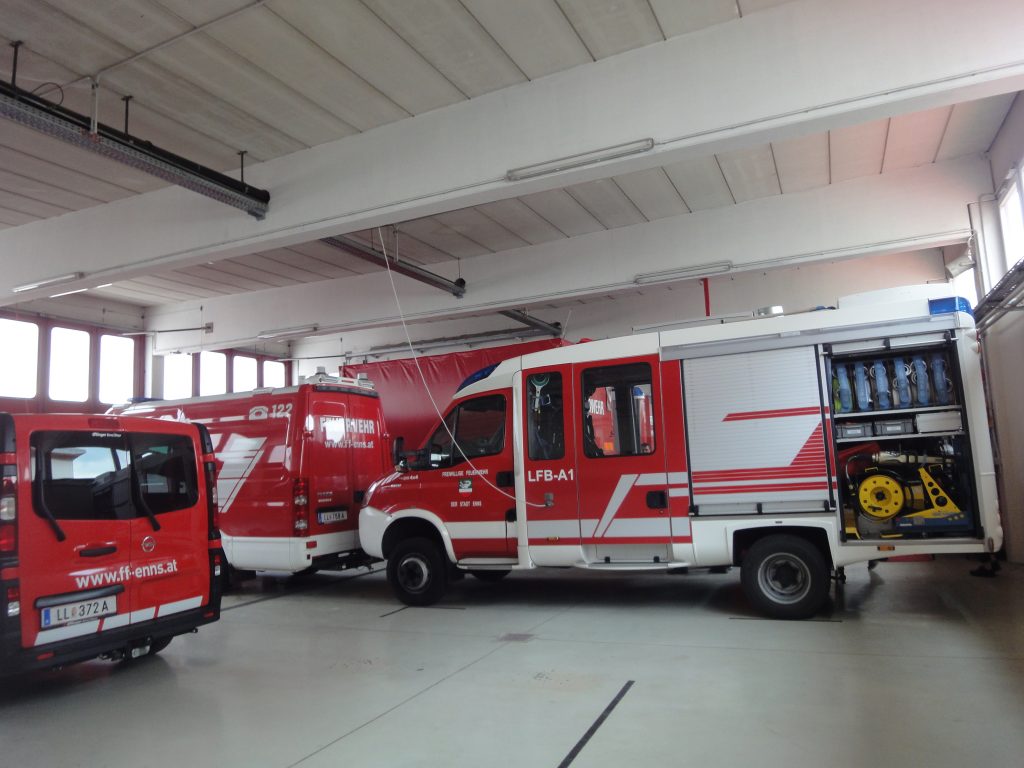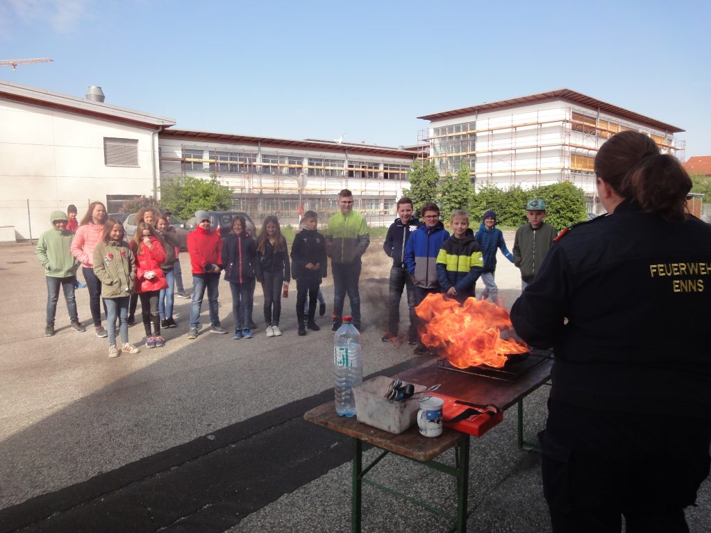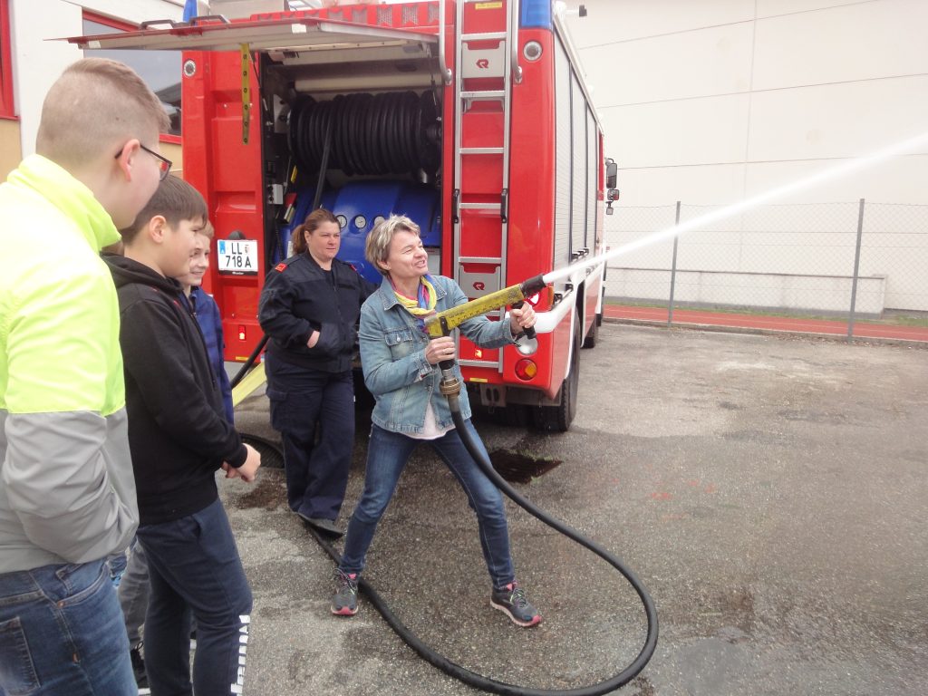 Auch heuer konnten wir, die 1B und 1E Klasse, anlässlich des Hl. Florian Gedenktages wieder die Feuerwehr Enns besuchen. Frau Anita Stummer, Oberbrandinspektorin, und Werner, der Jugendwart, nahmen sich für jede Klasse zwei Stunden Zeit. Sie zeigten uns, wie man brennendes Fett löscht, im Schulungsraum schauten wir den Imagefilm der FF, bekamen allgemeine Informationen zur FF Enns und unsere Fragen beantwortet, in der Fahrzeughalle bestaunten wir die Autos für die Brandlöschung und für die technischen Einsätze, packten die „Schere“ und den „Spreizer“ an, dabei hat es uns fast umgehauen, weil sie so schwer sind. Wir bedienten Feuerlöscher und fuhren mit der Drehleiter schaurige 28 Meter hoch. Wie zu erwarten machte es uns Spaß, die Hochdruckspritze zu bedienen – der Rückstoß beeindruckte uns!