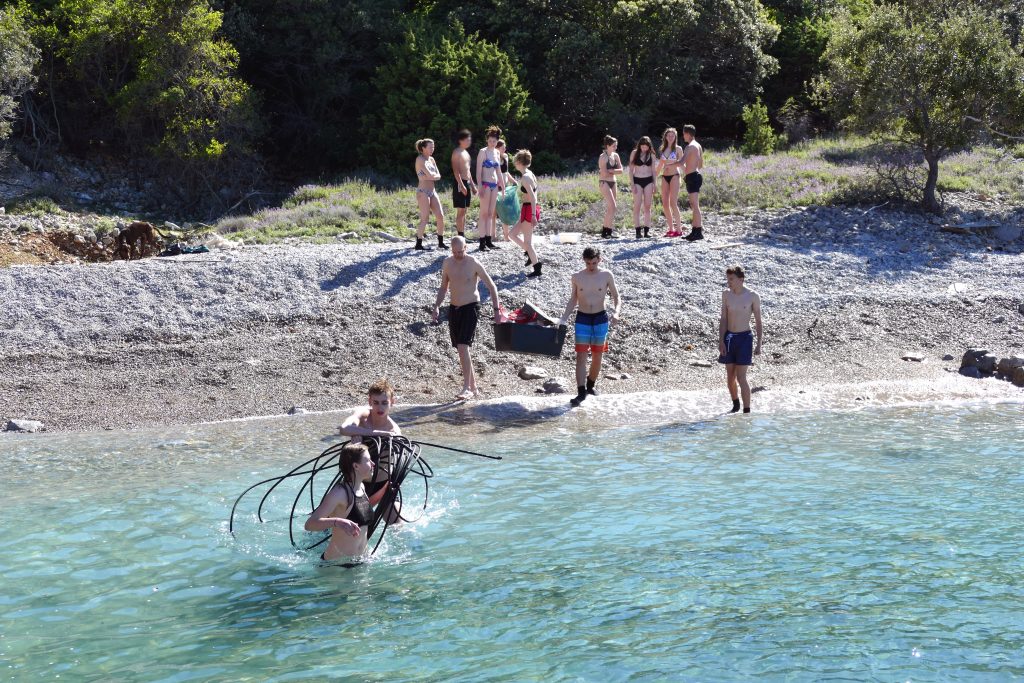 Am Donnerstag, endlich, Traumwetter. Blitzblauer Himmel. Keine Wolke. Schon nach dem Frühstück fuhren wir mit dem Boot nach Otok Plavnik, eine unbewohnte Insel. Dort schnorchelten wir in türkisblauem Wasser und sahen die Fischarten, die wir am Vortag kennengelernt hatten. Zu Mittag bekamen wir von der Bord Crew ein fantastisches Essen serviert. Am Nachmittag gingen wir vom Meer aus ins Innere der Insel, um dort auf Tarantel-Jagd zu gehen (mit Erfolg). Gegen Ende unseres Ausflugs wagten wir uns noch an ein Beach-Clean-Up und sammelten dabei etwa neun Säcke Müll, eine Kiste voll Plastik und ca. fünf Meter Kabel.