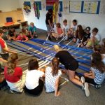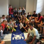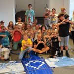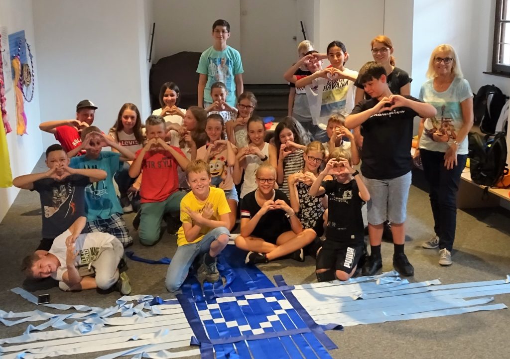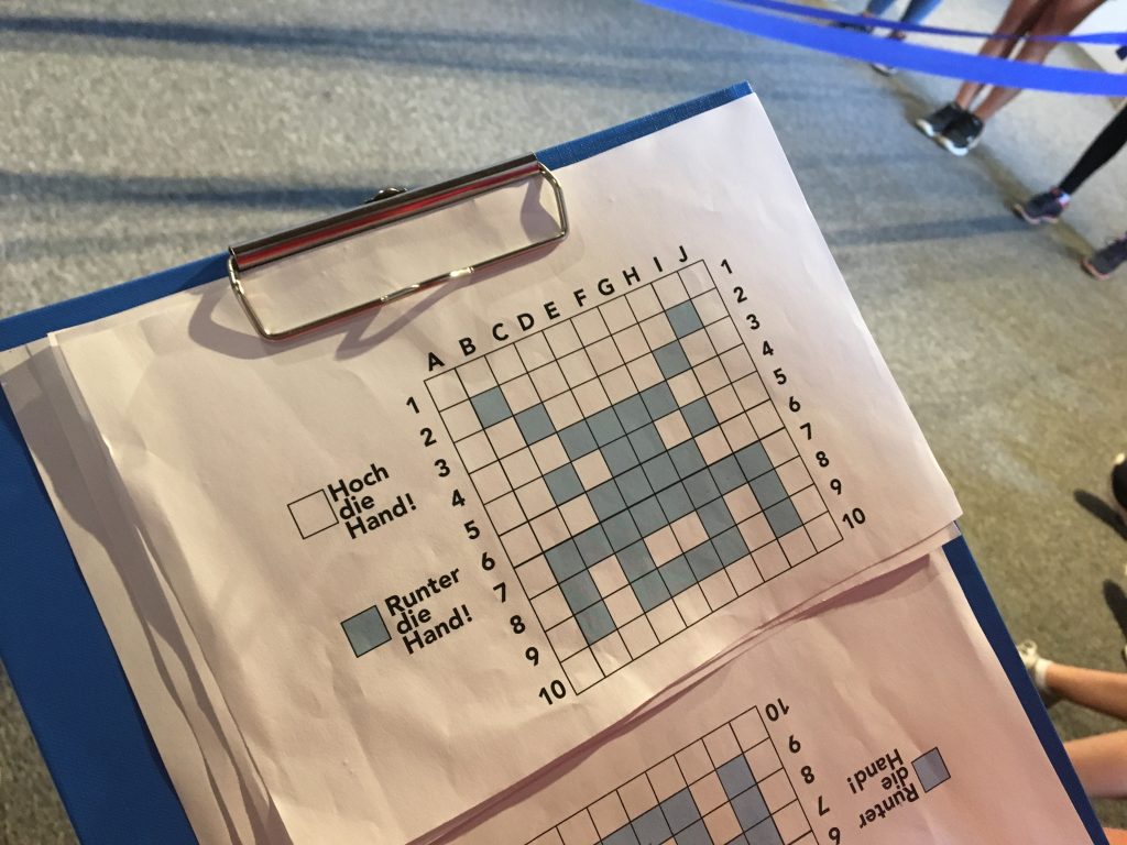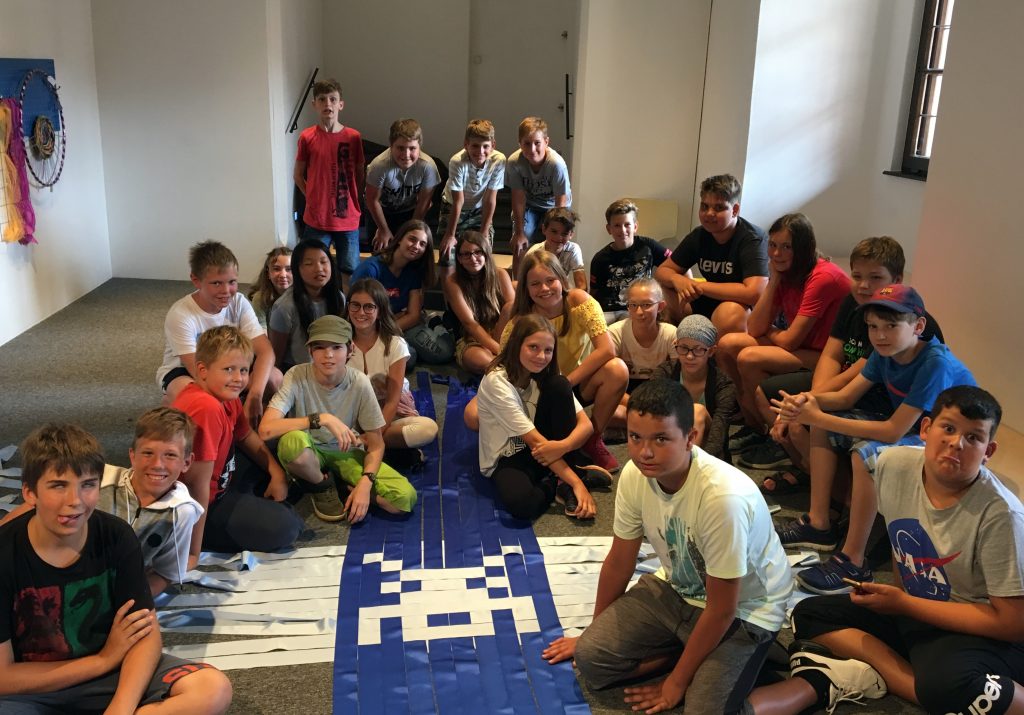 Auch im anschließenden Workshop ging es um das Handwerk. Die SchülerInnen dienten als „lebender Webstuhl“ und webten mit Hilfe der Lochtechnik des Jaquardwebstuhls ein Bild. Da hieß es gut zusammen zu arbeiten und auf Befehle zu hören.