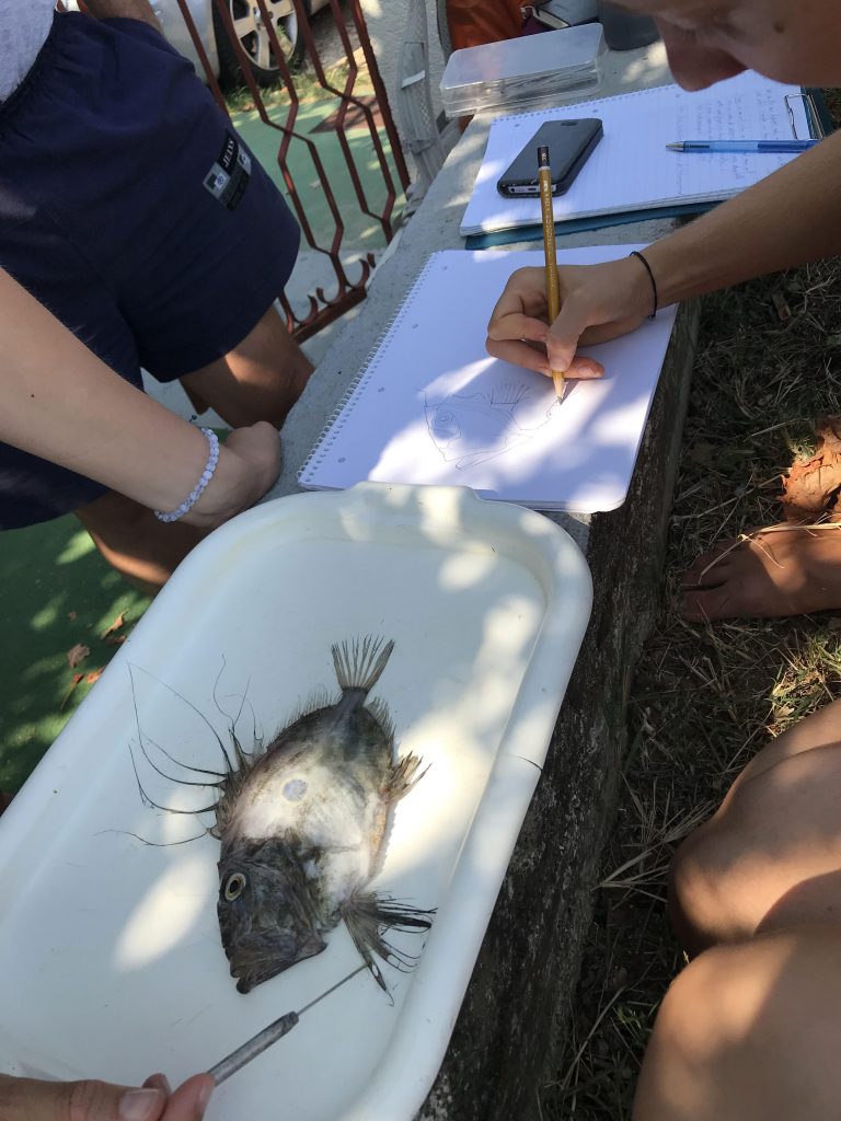 Die spannenden Tage wurden sowohl an Land, als auch auf Forschungsbooten, Inseln und im Wasser verbracht, den Fischmarkt erforschend, in Bergen von Fischernetzinhalten wühlend, präparierend und sezierend und in Sonne und Schatten fleißig mitnotierend.