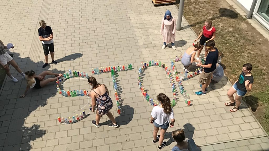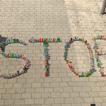 Die Schülerinnen und Schüler der GWKE-Gruppe 6AB verwendeten diese gesammelten Flaschen dann, um ein großes Bild zu legen. Zu lesen war „STOP“ – Stop zu Plastik, Stop zu Einwegflaschen, Stop zur Umweltverschmutzung. Über 200 Flaschen wurden gesammelt und die meisten wurden dann auch für das Bild verwendet. Ein tolles Projekt, das noch einige andere Teile beinhaltete (Plakate, Mülltrennungshinweise, Befragung am Buffet, Filme, selbstgemachte Videos und Bilder für den Schulbildschirm, Aufklärung in den Fächern Biologie und Geographie usw.), am Schulschluss des Jahres 2018/2019.