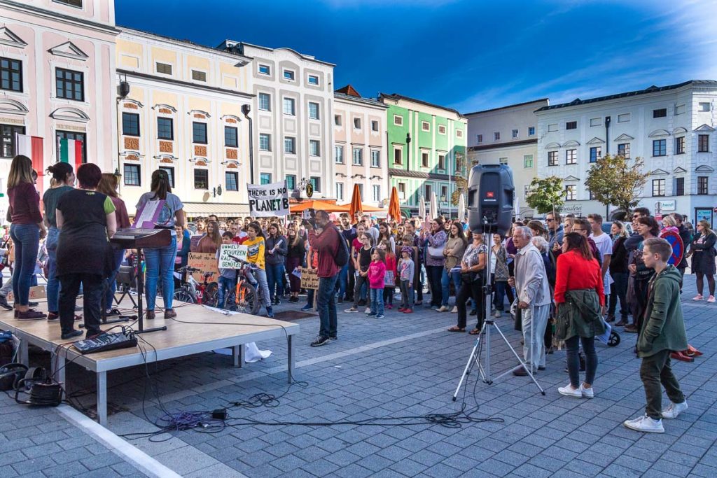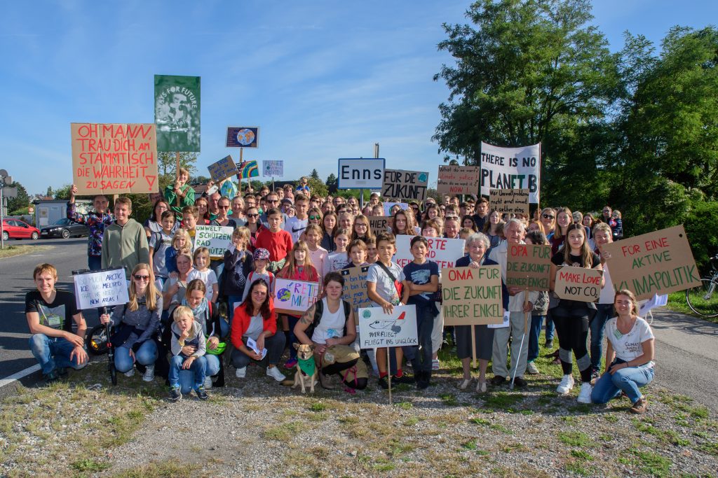 Rund 200 EnnserInnen im Alter von 3 bis 90 Jahren nahmen an der Demo teil. Treffpunkt war beim Ennser Ortsschild an der Lorcherbrücke, wo gleich ein Gruppenfoto gemacht wurde: Enns für die Zukunft. Danach zogen wir mit Liedern und Sprüchen zum Thema Klimaschutz in einem bunten Demonstrationszug auf den Hauptplatz. Bei der dortigen sehr eindrucksvollen Kundgebung beeindruckten unsere SchülerInnen die Zuhörenden mit gekonnter Moderation und kompetenten Reden. Zwar wurden viele bedrückende Fakten zum Klimawandel ausgesprochen, doch waren die Lebensfreude und Hoffnung unserer jungen Leute deutlich spürbar. Denn wieder einmal konnte man fühlen, dass der Klimaschutz vielen Menschen inzwischen sehr wichtig ist und manche dafür sogar auf die Straße gehen.