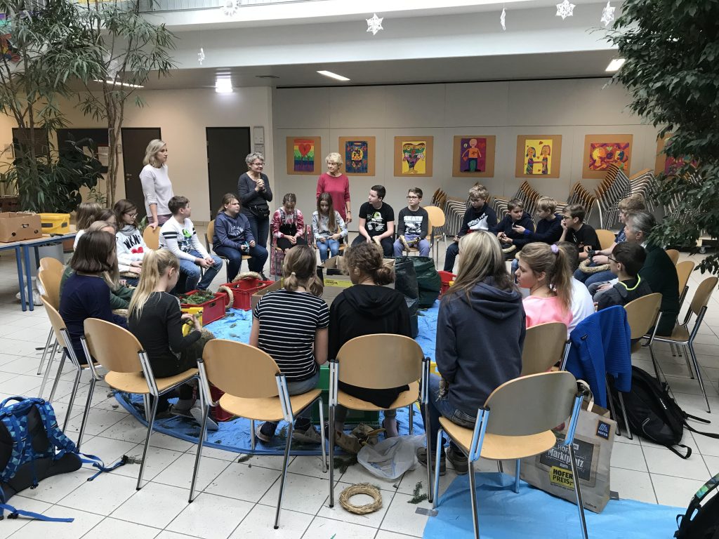Auch mehrere Schülerinnen und Schüler aus der Oberstufe bleiben freiwillig am Nachmittag in der Schule, um bei weihnachtlichem Duft in gemeinschaftlicher Atmosphäre „ihren“ Kranz zu binden.