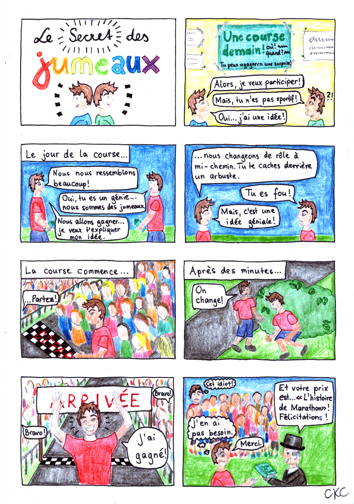Nach langer Diskussion hatten wir uns darauf geeinigt, das Journal für Sportler zu machen. Rasch bildeten wir vier Dreiergruppen – und die Arbeit begann. Jedes Team schrieb drei Texte und zeichnete einen Comic. Zwischendurch bekamen wir – je nach Gruppe mehr oder weniger oft – gutgemeinte Stupser, damit wir aufhörten zu prokrastinieren und uns konstruktiv auf Französisch unterhielten. Letztendlich schafften wir es, jeweils vier Interviews, Sportlerpräsentationen, Musikervorschläge sowie Comics zu verfassen beziehungsweise zu zeichnen, das alles noch im Informatiksaal zu formatieren und ein Gruppenfoto zu schießen – fertig war das Journal.