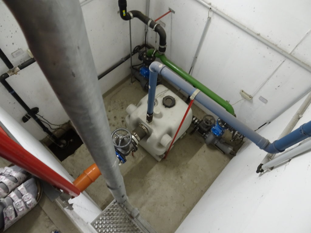 Im Vorraum des Heizraums befindet sich eine Abwasserhebeanlage. Das Abwasser, welches im Keller anfällt (Werkräume, Duschen in Sporthalle) kann nicht direkt in den Kanal abfließen, da die Kanalrohre in der Straße nicht tief genug liegen. Das Abwasser wird also in einem 1000-Liter-Tank gesammelt und von einer Pumpe in den Kanal hinaufgepumpt.