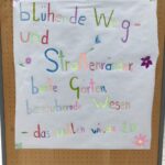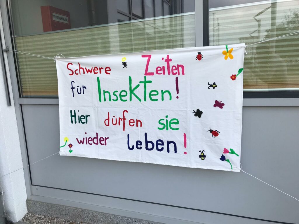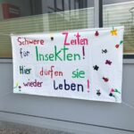 Damit auch für andere Schüler*innen des b[r]g Enns sofort ersichtlich ist, warum die Klasse 2D diese Wildblumenwiese angepflanzt hat, malten eine Gruppe von Schülerinnen unter Anleitung von Prof. Livia Haiger ein großes Plakat (eigens dafür zusammengenäht von Prof. Haiger), um auf die Situation der Insekten hinzuweisen. Auch dieses Plakat hängt nun vor dem Haupteingang des Schulgebäudes.