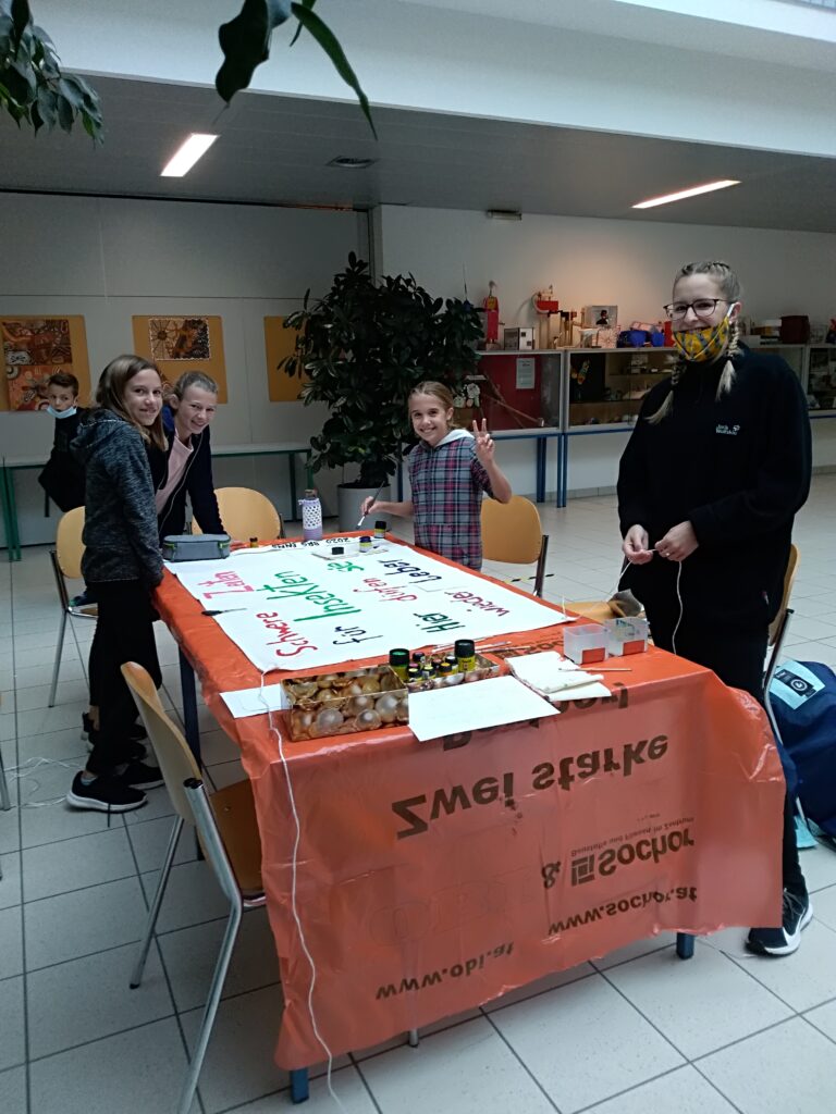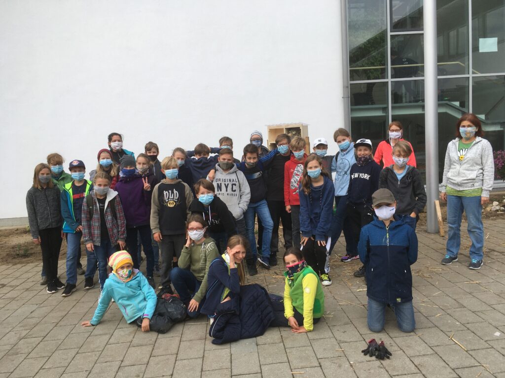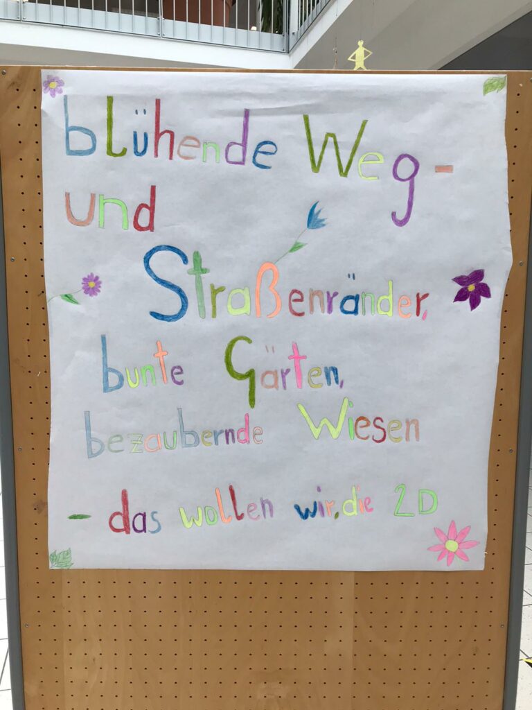 Welche Rolle spielen Wildinsekten gegenüber Honigbienen? Warum haben wir eine Magerwiese angesetzt? Was sind eigentlich heimische Wildpflanzen? Warum gibt es ein Insektensterben? Mit all diesen Fragen hat sich eine weitere Gruppe von Schüler*innen der 2D beschäftigt. Sie haben sich dazu unter Mithilfe von Prof. Christiane Achleitner in der Bibliothek eingelesen und Informationsblätter gestaltet, die demnächst ebenfalls vor dem Haupteingang zur Information für alle zur Verfügung stehen werden.
