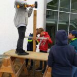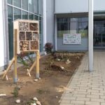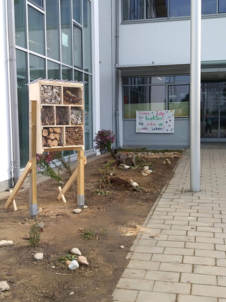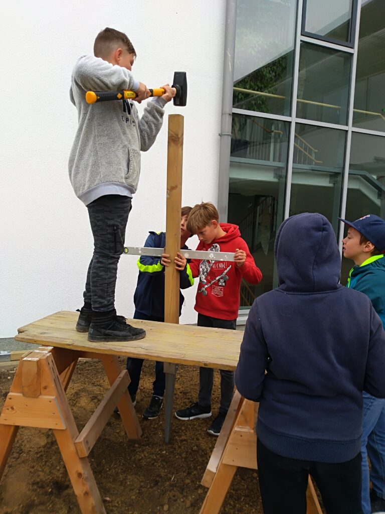 Eine andere Gruppe beschäftigte sich währenddessen unter der Mithilfe von Prof. Johann Gölles mit dem Bau eines großen Insektenhotels, damit auch dort die Insekten sich ansiedeln können und eine Nisthilfe haben. Dazu schlugen die Schüler Pflöcke in den Boden, an denen das Insektenhotel anschließend befestigt wurde. Es ist jetzt vor dem Haupteingang zu bewundern.