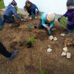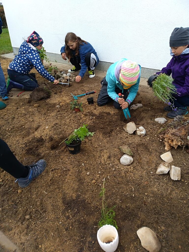 Am 29.09.2020 war es so weit. Die Schüler*innen der Klasse 2D setzten den Plan, etwas für das Überleben der heimischen Insekten zu tun, in die Tat um. Dazu wurde der Grünstreifen vor dem Haupteingang des b[r]g Enns mit einer Gartenfräse (Leihgabe von Andreas Krawinkler) von unserem Schulwart Christian Bart aufgelockert. Anschließend entfernten eine Gruppe von Schülern*innen der 2D gemeinsam mit Prof. Astrid Wiesmayr und Prof. Heike Moser Gras- und Beikrautwurzeln. Im weiteren Verlauf wurde der Boden mit Sand (Spende von Harald Radler) abgemagert und anschließend mit heimischen Insektenpflanzen und Zwiebeln von Frühblühern, die von vielen Lehrkräften des b[r]g Enns zur Verfügung gestellt wurden, bepflanzt. Die Gerätschaften (Scheibtruhe, Schaufeln, Rechen etc.) sind dankenswerterweise von einigen Lehrkräften leihweise zur Verfügung gestellt worden. Totholz, Steine, Schneckenhäuser und ein kleiner Sandbereich wurden ebenso auf die Fläche gebracht, um Wildinsekten Nist- und Wohnmöglichkeiten zu bieten und die noch freien Flächen, mit für diese Region geeigneten Wildblumensamen, besät.