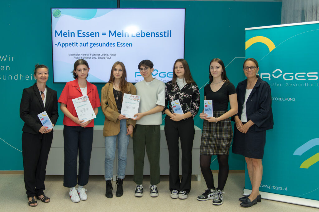 Fiolla Aruqi, Leonie Füchtner, Helene Mayrhofer, Paul Sabau und Zoe Schrafler stellten am 1. Juli im Bruckner Center beim Untenehmen Proges ihr Projekt „Mein Essen – mein Lebensstil“ und das Ergebnis vor.