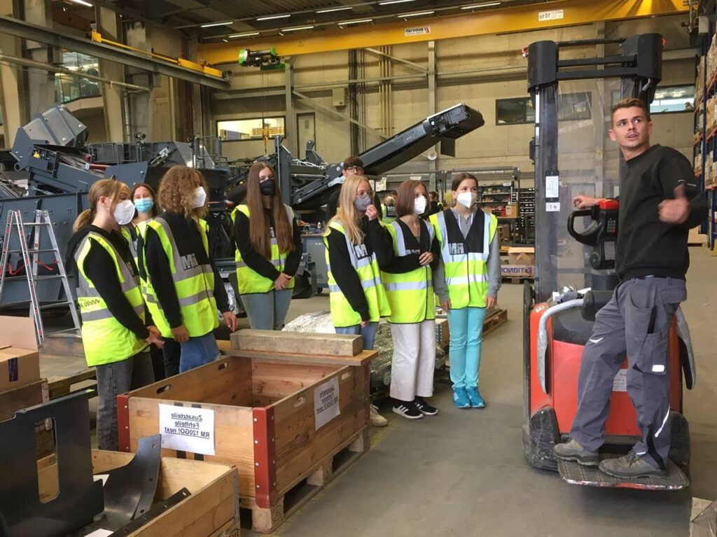 Zu Fuß und mit dem Zug geht es für jede der vierten Klassen an einem eigenen Termin vor oder nach der ibobb-Woche mit ihrem KV und einer zweiten Lehrperson klimafreundlich nach Pichling. Nach einem Kennenlern-Vortrag mit den besonders für unsere Schüler*innen interessanten Schwerpunkten der Dualen Ausbildung (Verkürzte Lehre im Anschluss an die Matura und damit direkter Einstieg in einen begehrten, sicheren und gut bezahlten Facharbeitsberuf) und der Vorstellung der Berufsfelder und Skills geht es durch Verwaltung und Produktion. Wir werden in Kleingruppen geführt von freundlichen und begeisterten Lehrlingen und dürfen nicht nur zusehen, sondern auch jederzeit Fragen stellen. Also spazieren wir ins Büro des CEO genauso wie zu den Assistentinnen der Geschäftsführung und durch Meeting-Bereiche. Wir freuen uns mit einer ehemaligen Schülerin unserer Schule, die gerade ihre Lehre mit Auszeichnung abgeschlossen hat. Danach geht es in die Produktionsbereiche, wo wir die Arbeit direkt an den riesigen Geräten beobachten können. Und als Abschluss wartet noch eine Jause samt Getränken auf uns, wo nochmals über alles geplaudert wird. Ungezwungen – unkompliziert und auf Augenhöhe. Tolle Sache!