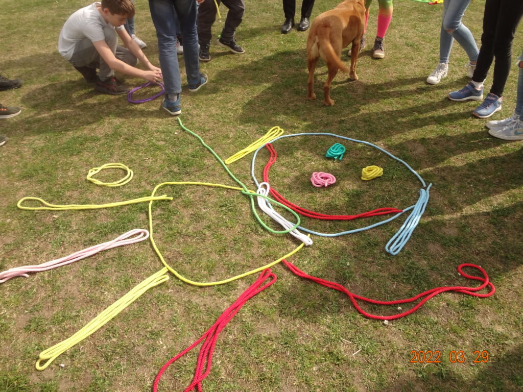 Danach mussten wir mit Hilfe von Seilen einen Hund mit allen Körperteilen darstellen. Wir sollten herausfinden, wo man einen Hund berühren darf, ohne dass er sich unwohl oder eventuell auch ängstlich fühlen würde.