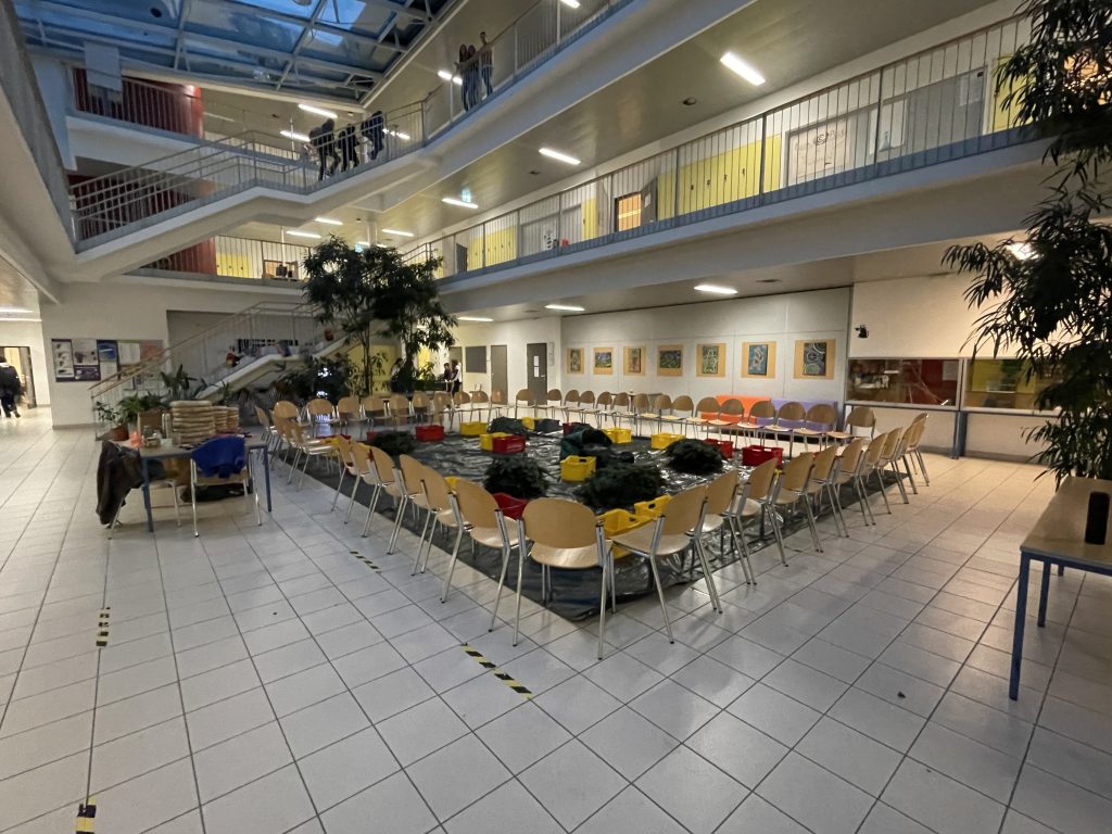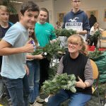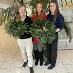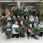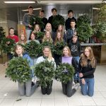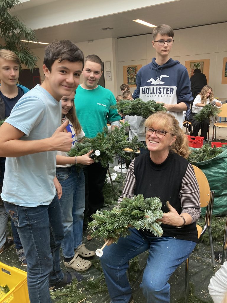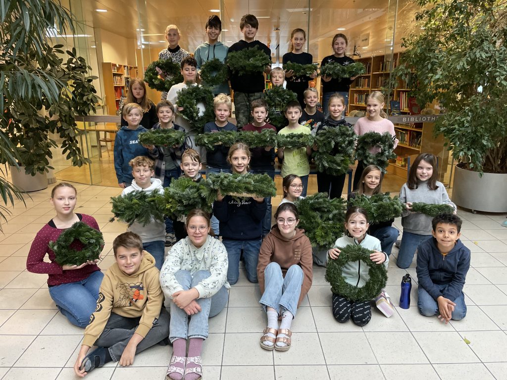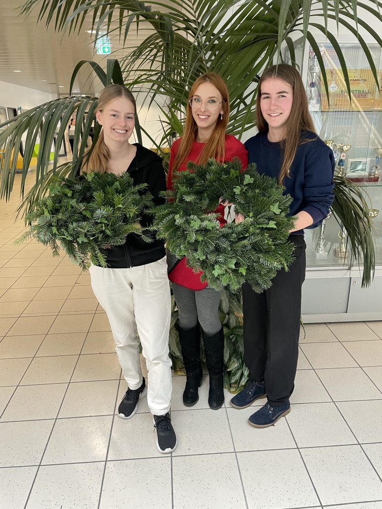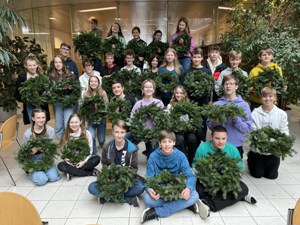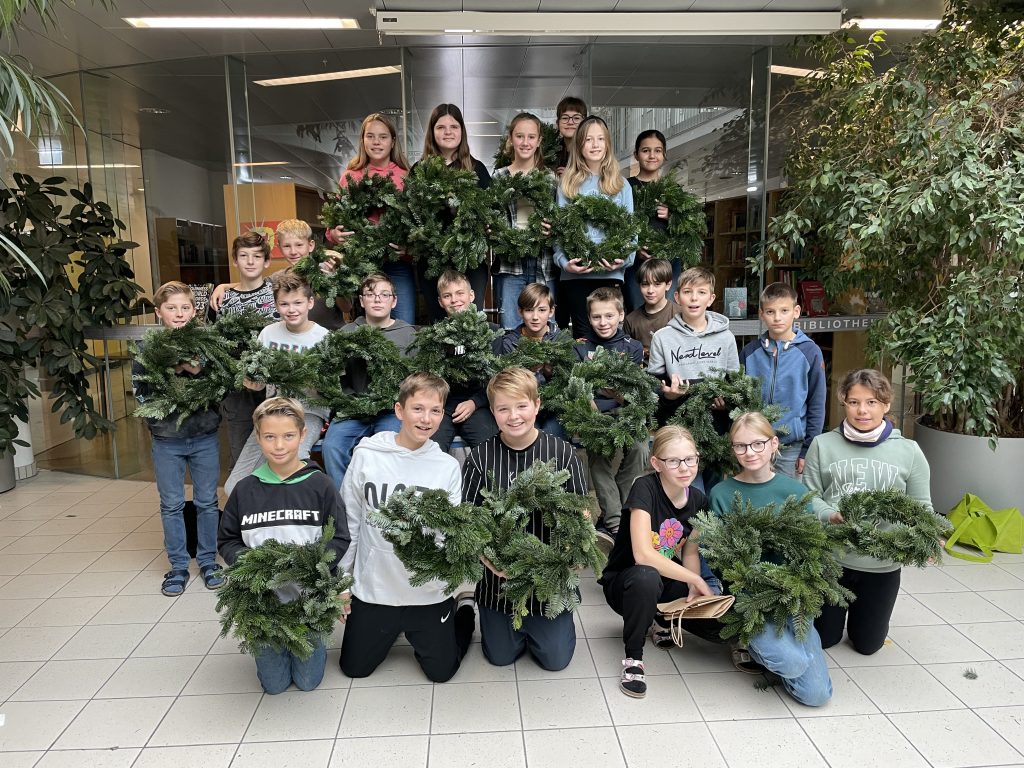 Wir halten unsere Kränze, die wir am 24.11.2022 gebunden haben, mit vollem Stolz in unseren Händen. Wieder einmal konnten die Schüler*innen beweisen, wie viel Geschick, Freude und Motivation beim Adventkranzbinden in ihnen steckt.
