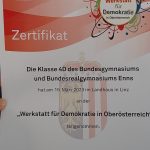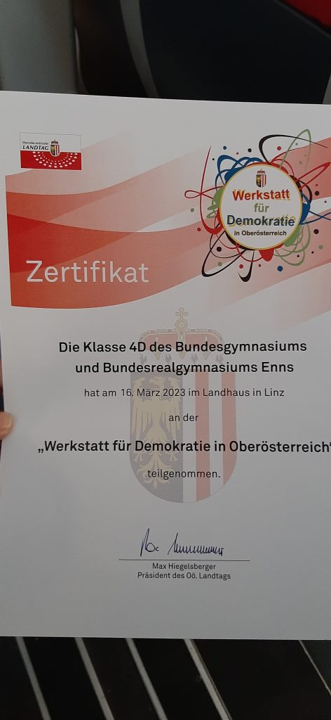 Am Ende des Workshops bedankte sich Herr Max Hiegelsberger, Präsident des Oberösterreichischen Landtages, persönlich bei allen Schüler*innen für die Arbeit und die aktive und gelungene Auseinandersetzung mit den demokratischen Werten und überreichte den Schüler*innen der Klasse 4D eine Urkunde.