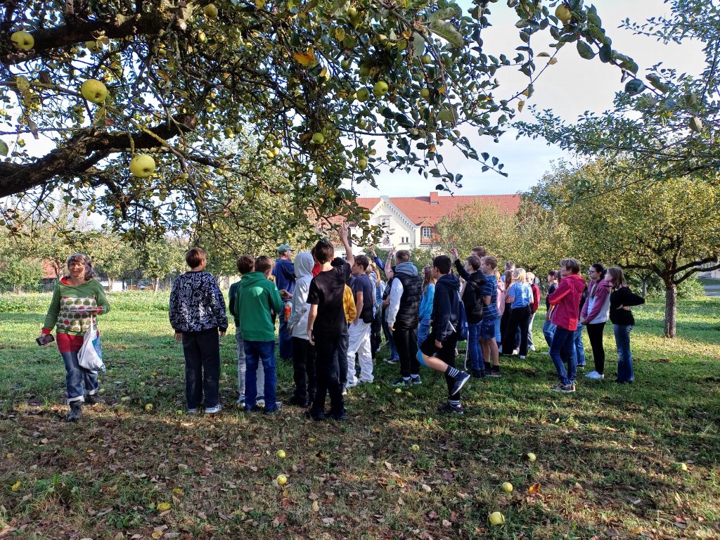 Die Schüler*innen der Klassen 3B und 3C durften an diesem Vormittag ein paar der alten Apfelsorten kennenlernen und kosten. Dazu zählten Sorten wie Klöcher Maschanzker (sehr schmackhaft), der Mauthausner Linoniapfel (eher sauer, wie der Name schon sagt) oder die besondere Sorte Frankfurter (schmeckt sehr aromatisch nach Apfel und nicht nach Wurst). Ebenso wurde von Herrn Richard Mahringer (Experte für Permakultur und Obstbaumvermehrung), der uns durch die Streuobstwiesen führte, die Bedeutung der Erhaltung von alten Apfel- und Birnensorten erklärt und ein geschichtlicher Hintergrund geliefert.