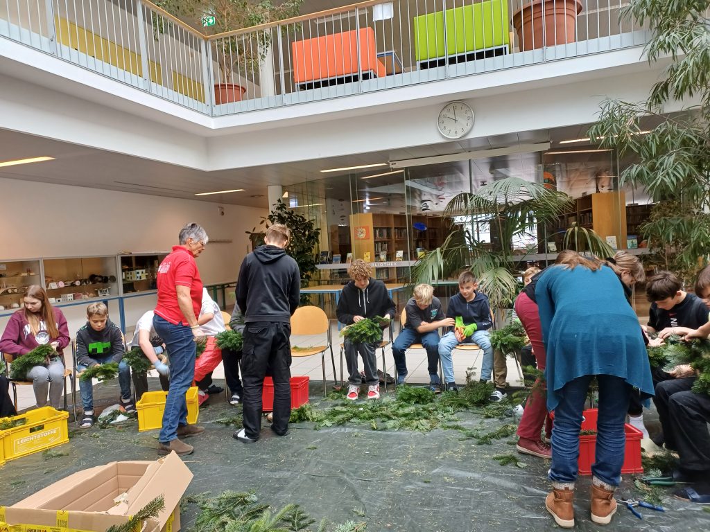 Das Reisig wurde uns vom Christbaumhof Sattlauer geliefert. Der Duft der Tannennadeln verbreitete sich im gesamten Schulgebäude und stimmte damit auf die bevorstehende Adventzeit ein.