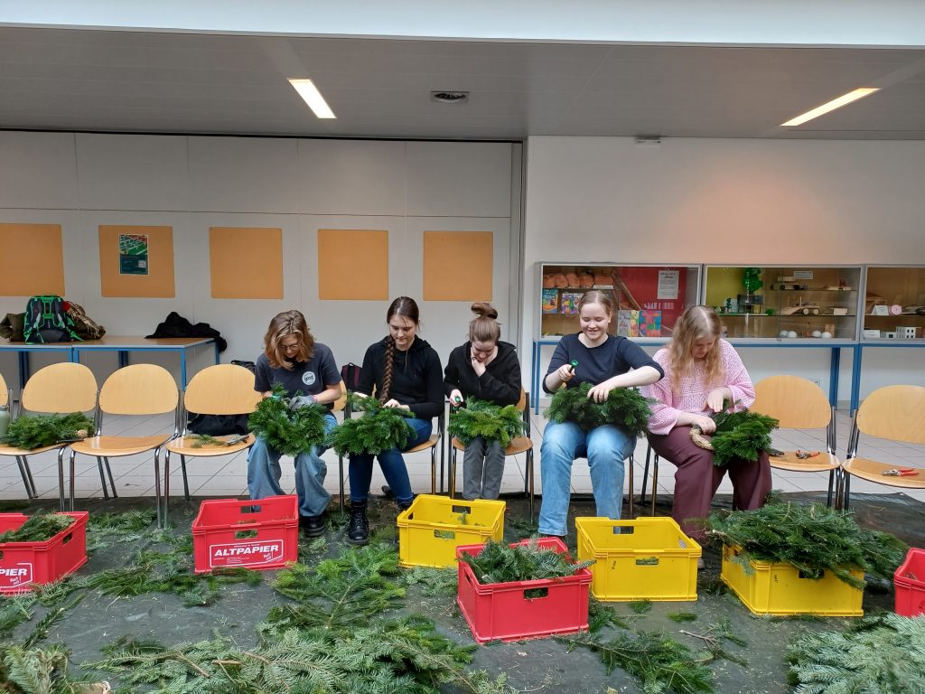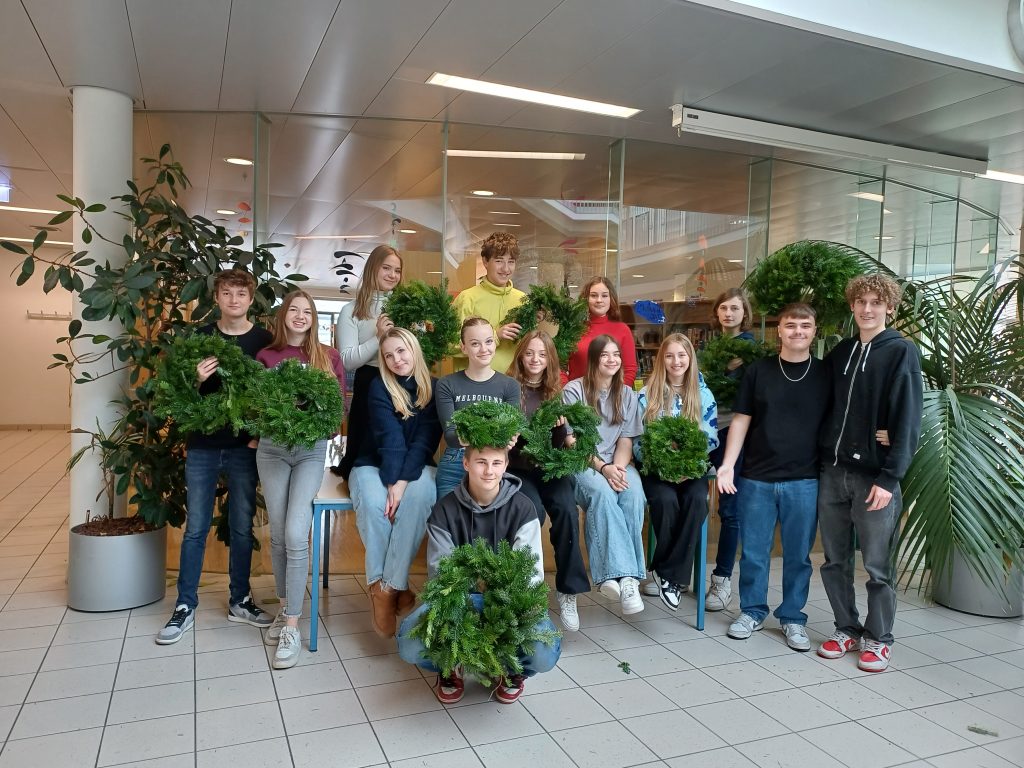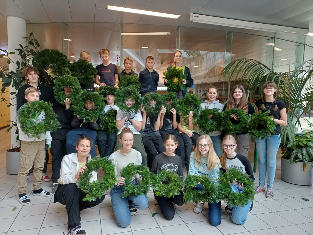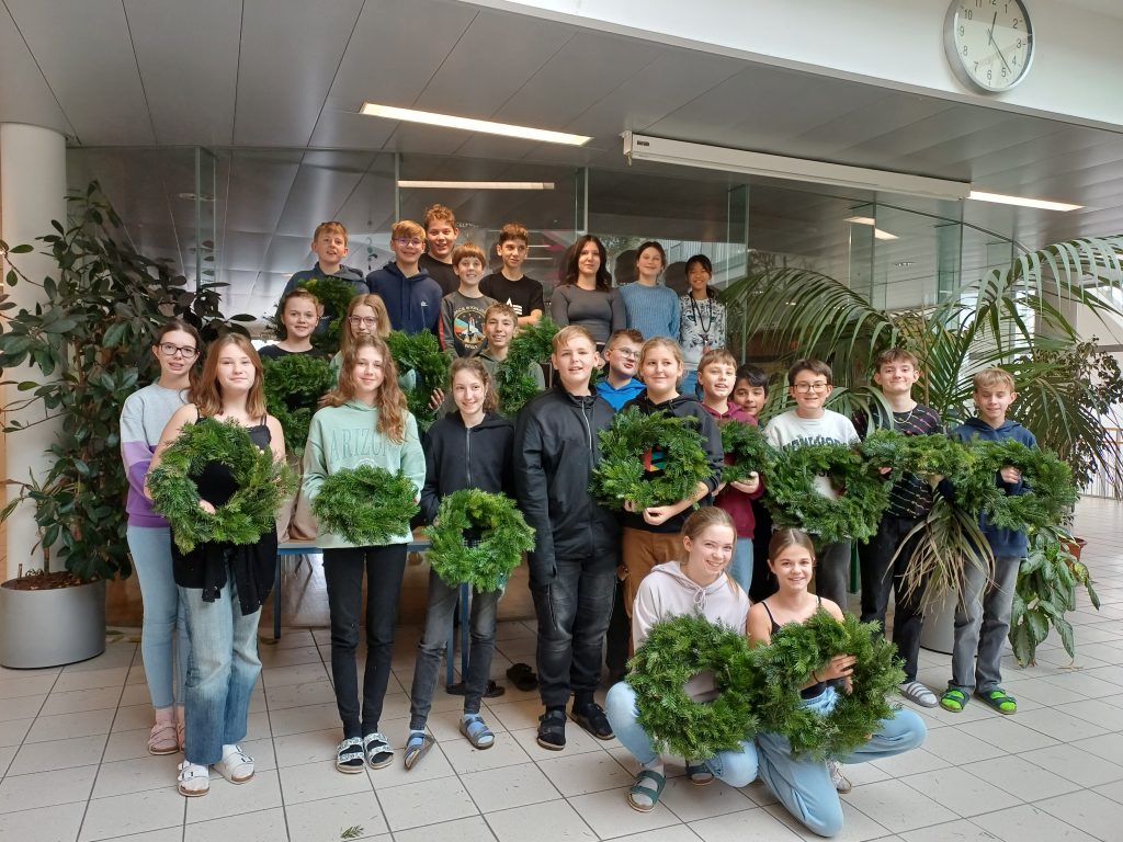 Am 27.11.2023 fand zum wiederholten Male das traditionelle Adventkranzbinden statt. Kurz vor dem 1. Advent konnten somit am Vormittag die Klassen 1D, 3D und 3C mit Unterstützung von fleißigen Helferinnen ihre Adventkränze selbst binden. Dabei wurden sie in die Technik des Reisigschneidens und -bindens eingeführt. Die Resultate konnten sich wirklich sehen lassen. Am Nachmittag hatten Oberstufenschüler*innen ebenfalls die Möglichkeit ihre Kränze selbst zu binden.