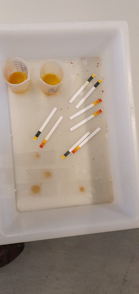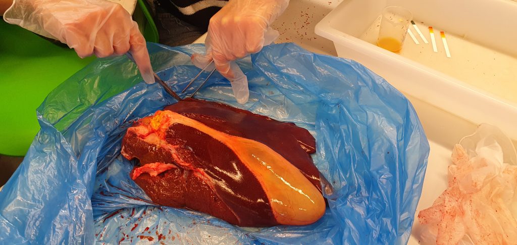 Nach Entnahme von etwas Gallenflüssigkeit wurde mittels pH-Messstreifen der pH-Wert bestimmt und die Aufgaben des Gallensaftes für den menschlichen Körper besprochen.