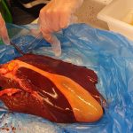 Bei der Untersuchung der Schweineleber wurde zuerst auf die Einteilung in die 4 Leberlappen eingegangen und mit dem Aufbau der menschlichen Leber verglichen. Es folgten eine genauere Betrachtung der zuführenden und ableitenden Blutgefäße, sowie die Freilegung der Gallengänge.