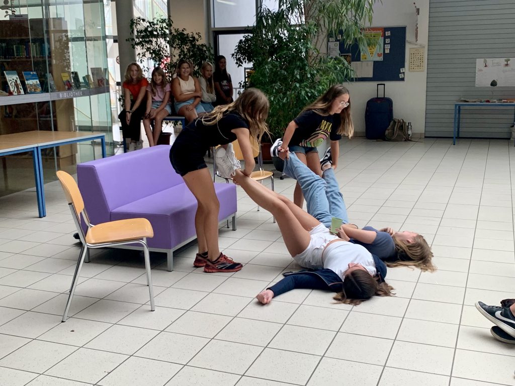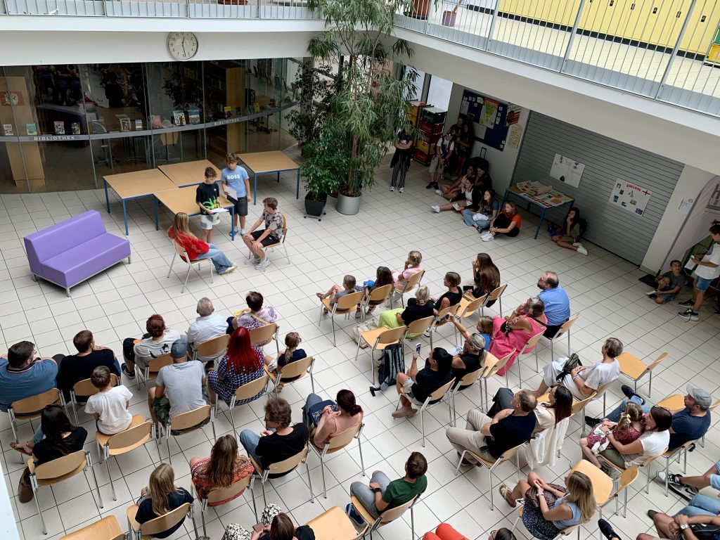 In der letzten Ferienwoche vom 02. bis zum 06. September galt an unserer Schule: ENGLISH ONLY! Drei Lehrer*innen aus England besuchten uns und verbrachten mit unseren Unterstufenschüler*innen eine spannende Englisch-Woche. In drei Gruppen wurde gespielt, getüftelt und gelacht – und ganz unbemerkt währenddessen Englisch gelernt! Auf dem Programm standen unter anderen ein aufregender Escape Room, interessante Shark Tank pitches, das Drehen von kurzen Videos, Geschichten erzählen sowie das Lösen eines merkwürdigen Kriminalfalles. Durch den spielerischen Umgang mit der Sprache und die Zeit mit den Native Speakern konnten Sprachkenntnisse passend für das neue Schuljahr aufgefrischt werden und das Selbstvertrauen beim Sprechen gestärkt werden. Am Ende der Woche gab es eine große Abschluss-Show, in der die Schüler*innen stolz vor großem Publikum präsentierten, woran sie die ganze Woche gearbeitet hatten – ganz auf Englisch, of course.