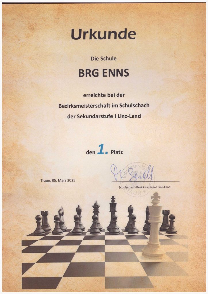 Am 5. März 2025 fand am BRG Traun die Schulschach-Bezirksmeisterschaft teil, an der das b[r]g Enns mit einer Mannschaft teilnahm. Unser Team bestand aus vier motivierten Spieler*inne*n: Noah Pleimer (2A), Thomas Kim (3D), Stella Haslinger (3D) und Hannah Schneiderbauer (3C).