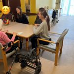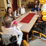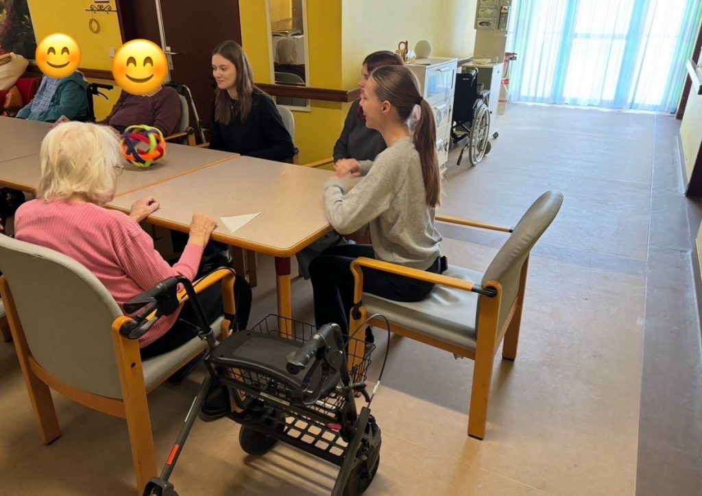 Im Vorfeld hatten wir uns im Ethikunterricht einige Aktivitäten überlegt, wie z.B. das Singen bekannter Lieder oder das Spielen gemeinsamer Spiele. Vor Ort passten wir unsere Ideen an die Wünsche der Bewohner*innen an. Besonders viel Freude bereitete den älteren Damen und Herren das gemeinsame Singen bekannter Lieder und das Spielen mit einem Ball, sei es ein Luftballon oder ein Gymnastikball. Schon das Rollen eines Balles über einen Tisch brachte die Gruppe zum Lachen.