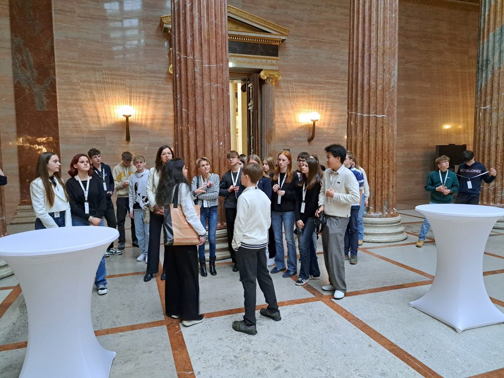 Nachdem wir uns mit einem Rap über Demokratie für die Teilnahme am Jugendparlament qualifiziert hatten (siehe Beitrag „Mit einem Rap ins Parlament“, 14. November 2024), fuhren 20 Schüler*innen der 5. Klassen sowie die Professorinnen Adelberger, Hahn und Wöckinger am 28. und 29. November 2024 nach Wien ins Parlament.
