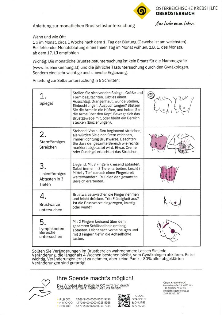 Brustkrebs kann auch in jungen Jahren und auch bei Männern auftreten. Eine monatliche Selbstuntersuchung der Brust und umliegenden Gebiete auf Knoten und Hautveränderungen können das Risiko minimieren bzw. eine Früherkennung und gute Heilungschancen ermöglichen.