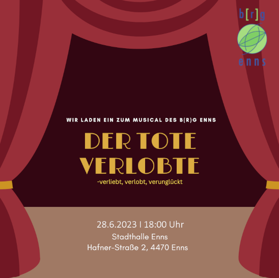 Die Musical AG des b[r]g Enns bringt am 28.06.2023 um 18:00 Uhr das durch Schüler*innen verfasste Musical „DER TOTE VERLOBTE – verliebt, verlobt, verunglückt“ zur Uraufführung. Ein buntes Bouquet aus einer spannender Verbrecherjagd, überraschenden Wendungen und einer großen Portion Humor erwartet Sie.